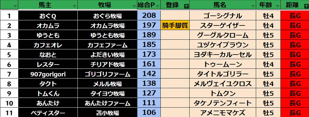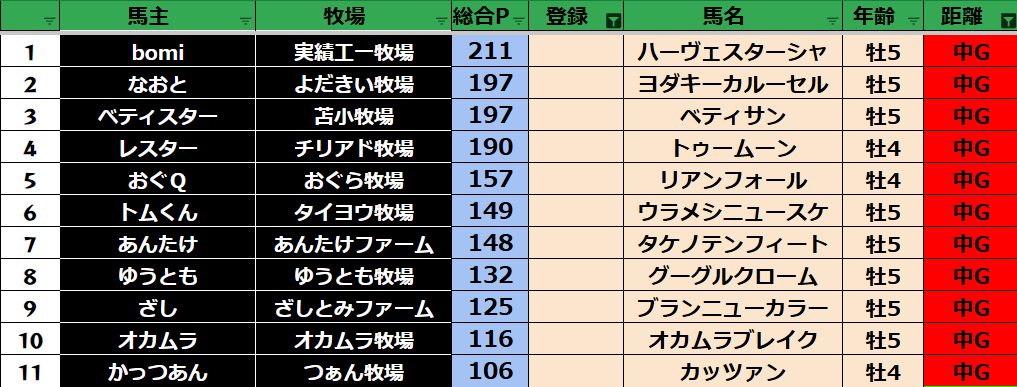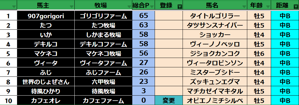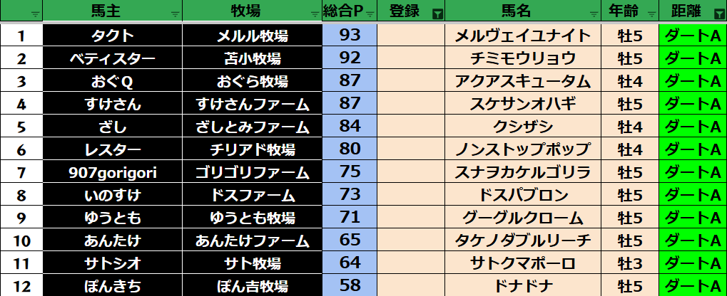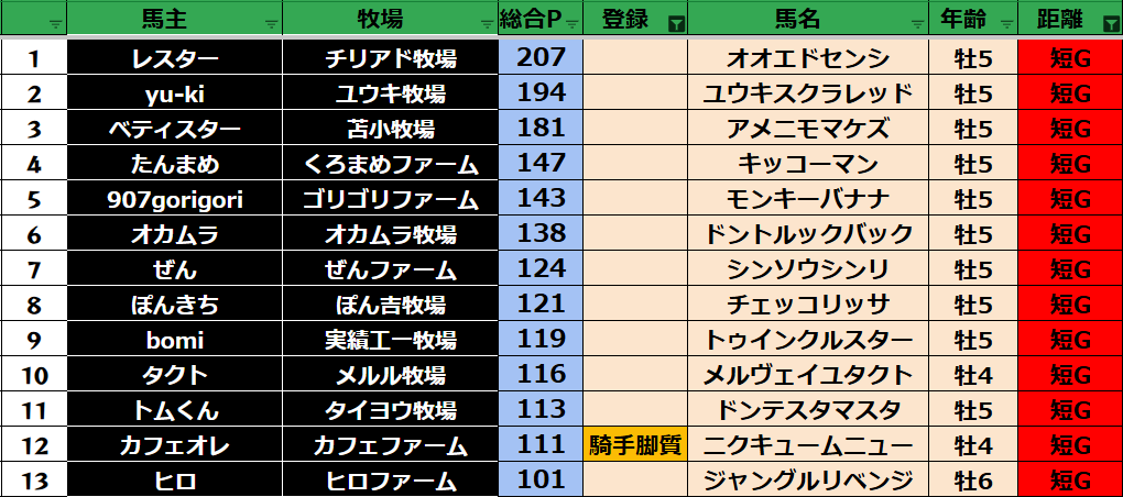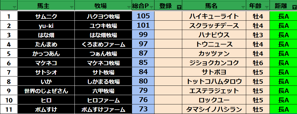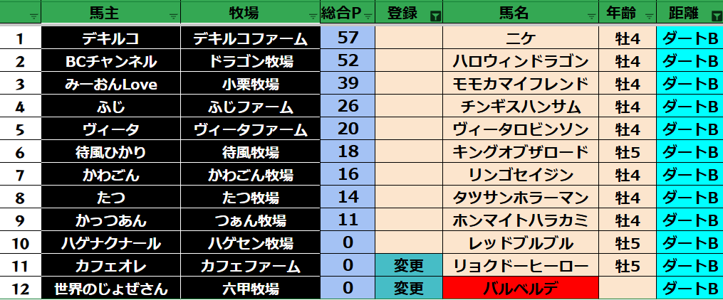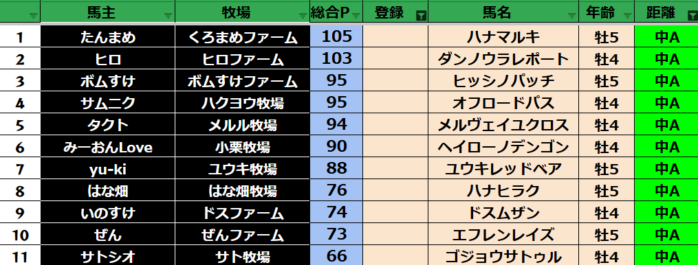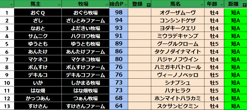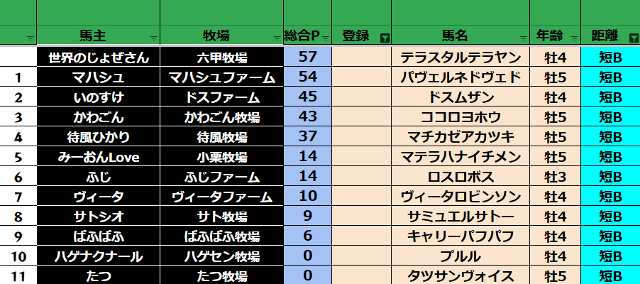 ゲーム ダビスタ 【ダビスタSwitch】suke3BC season5 6月3週目 クラス振り分け確定! 2025年6月20日 2025年6月20日 Facebook postはてブLINEPocketFeedly さぁそれでは今週の振り分けです! 参加馬主:39名 全登録馬:139頭 ダート:37頭 短距離:38頭 中距離:32頭 長距離:32頭 Contents 【ダート】 【短距離】 【中距離】 【長距離】 Facebook postはてブLINEPocketFeedly