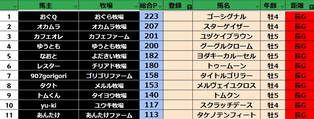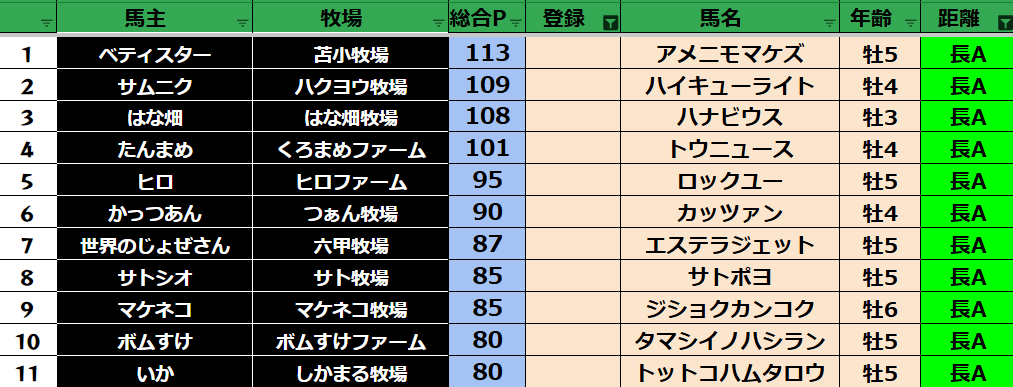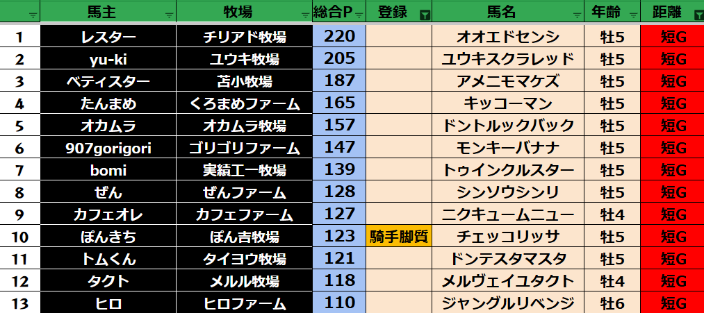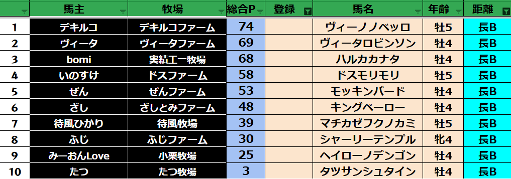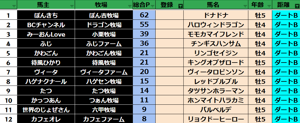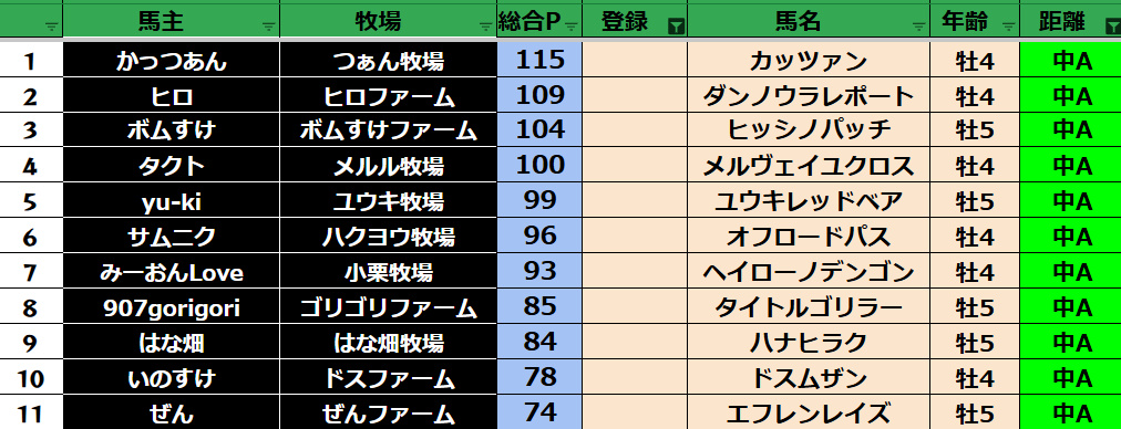 ゲーム ダビスタ 【ダビスタSwitch】suke3BC season5 7月1週目 クラス振り分け確定! 2025年7月2日 2025年7月2日 Facebook postはてブLINEPocketFeedly さぁそれでは今週の振り分けです! 参加馬主:39名 全登録馬:139頭 ダート:37頭 短距離:38頭 中距離:32頭 長距離:32頭 Contents 【ダート】 【短距離】 【中距離】 【長距離】 Facebook postはてブLINEPocketFeedly