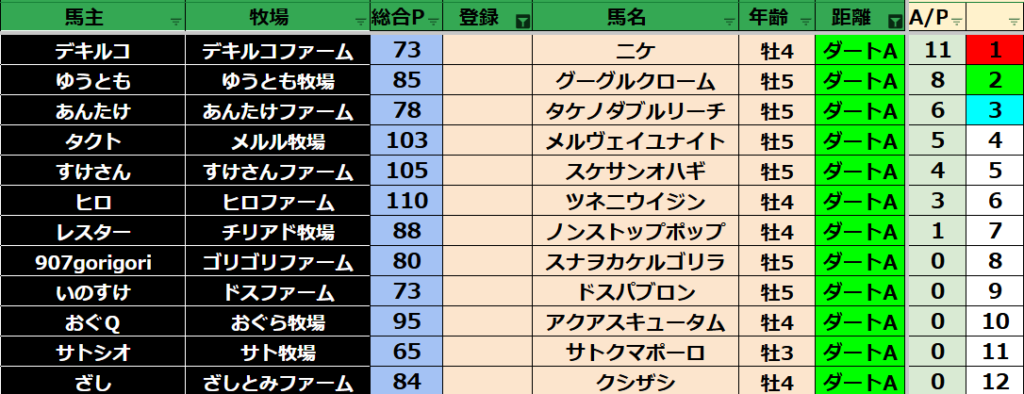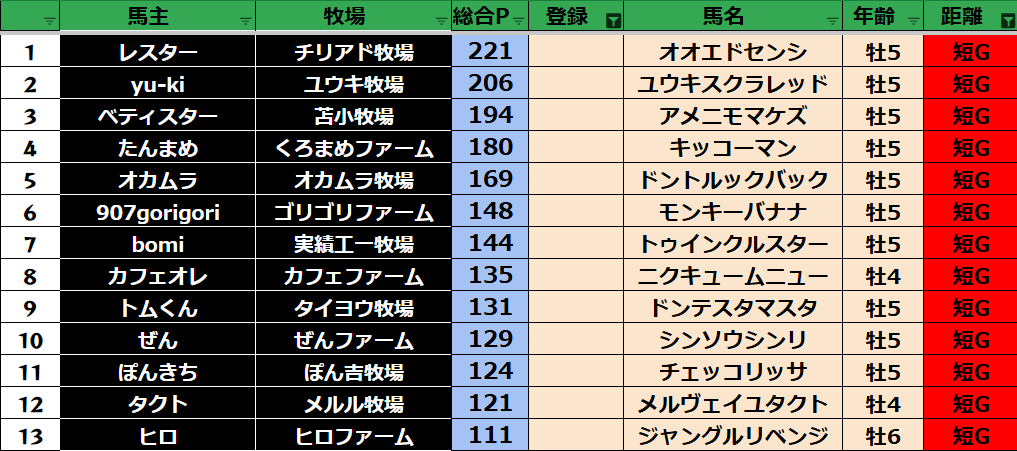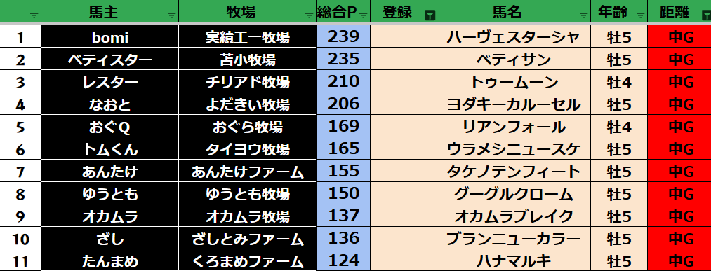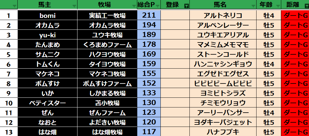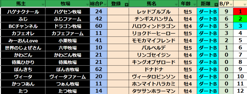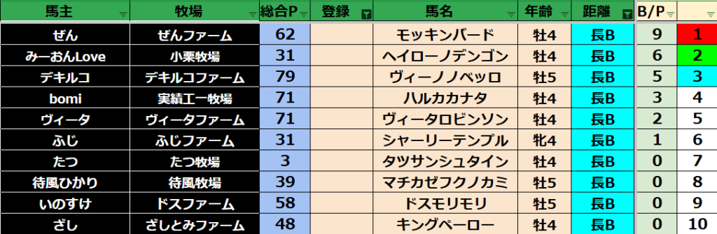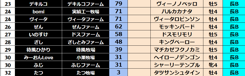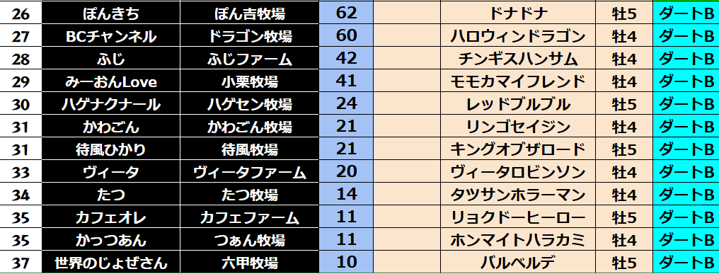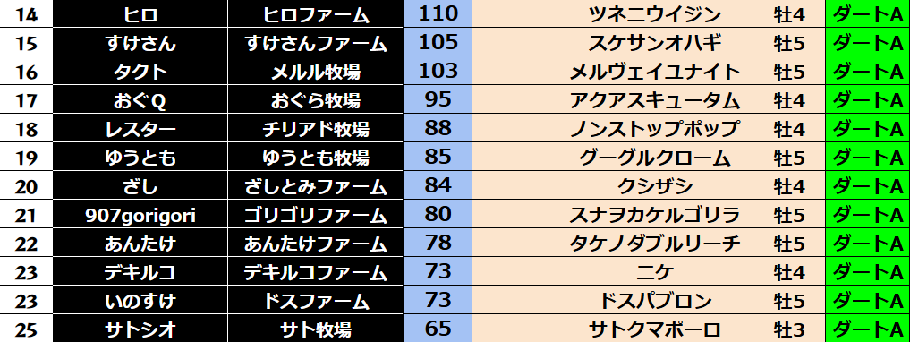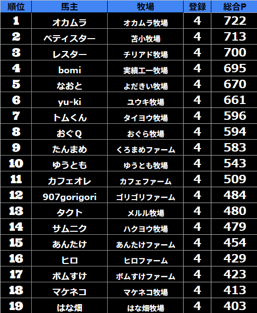 ゲーム ダビスタ 【ダビスタSwitch】suke3BC season5!! 7月1週目 結果発表!! 2025年7月8日 2025年7月8日 Facebook postはてブLINEPocketFeedly 先週の結果の方まいります! Contents 【ダート結果】 【ダートランキング】 【短距離結果】 【短距離ランキング】 【中距離結果】 【中距離ランキング】 【長距離結果】 【長距離ランキング】 【馬主総合ランキング】 Facebook postはてブLINEPocketFeedly