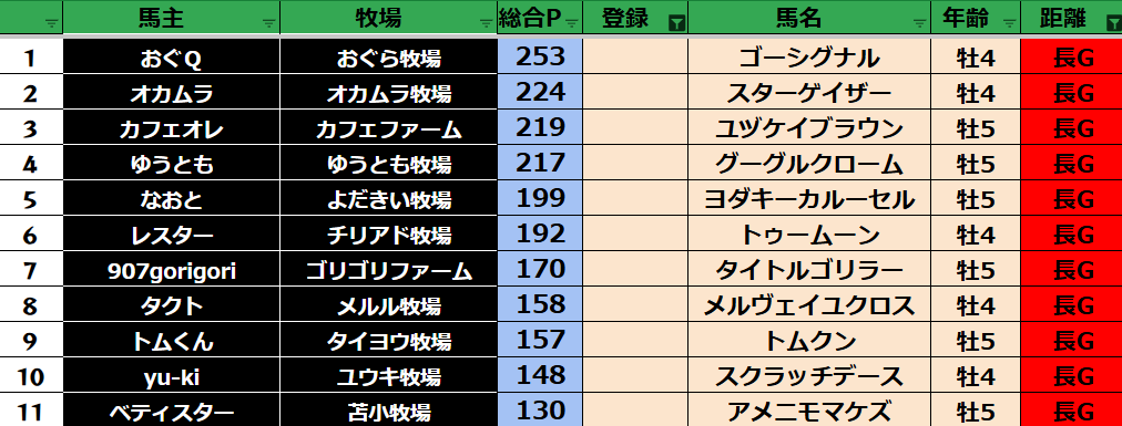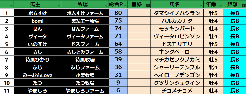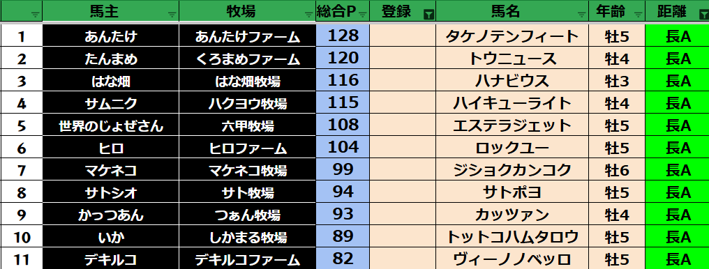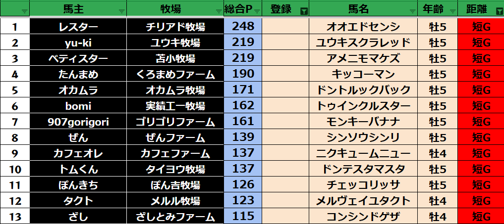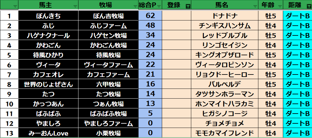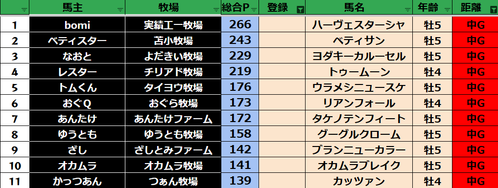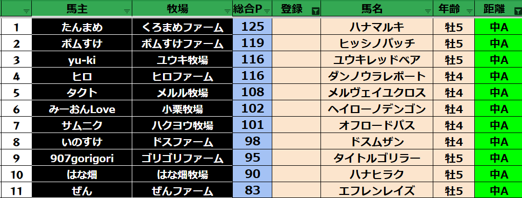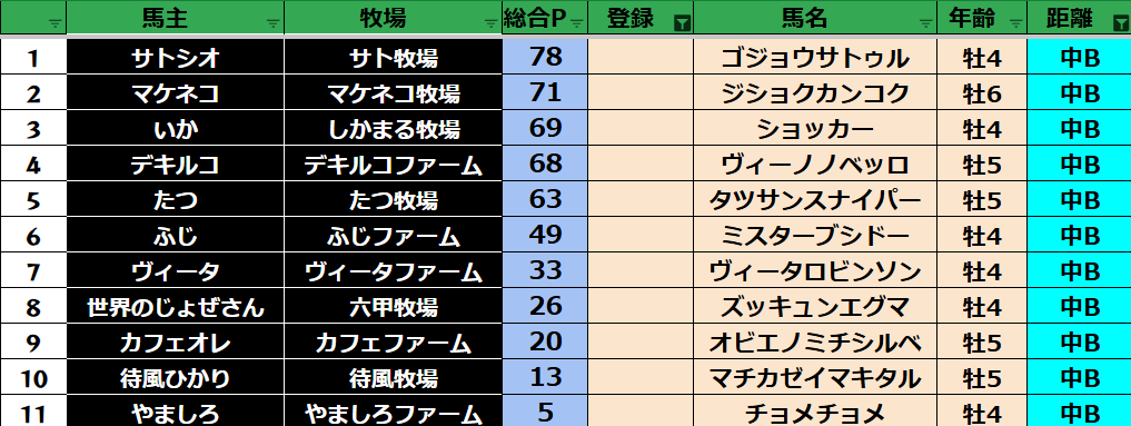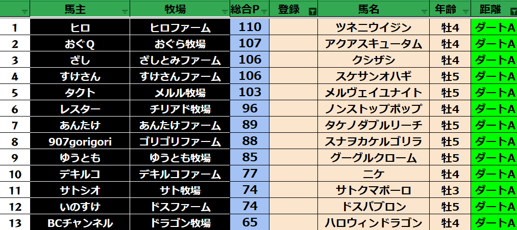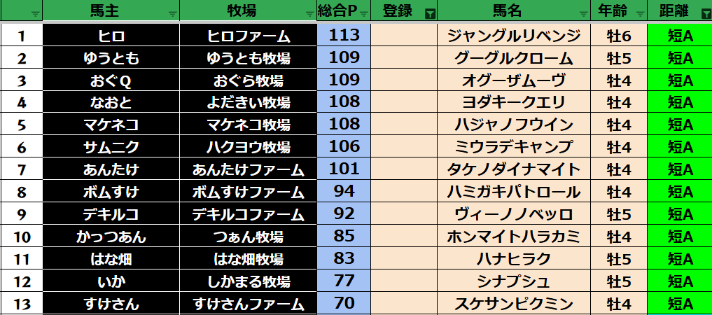 ゲーム ダビスタ 【ダビスタSwitch】suke3BC season5 7月4週目 クラス振り分け確定! 2025年7月25日 2025年7月25日 Facebook postはてブLINEPocketFeedly さぁそれでは今週の振り分けです! 参加馬主:40名 全登録馬:144頭 ダート:39頭 短距離:39頭 中距離:33頭 長距離:33頭 Contents 【ダート】 【短距離】 【中距離】 【長距離】 Facebook postはてブLINEPocketFeedly