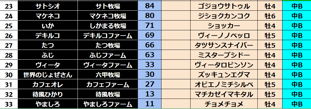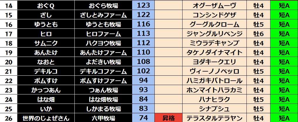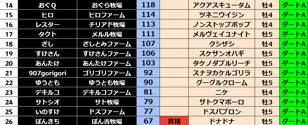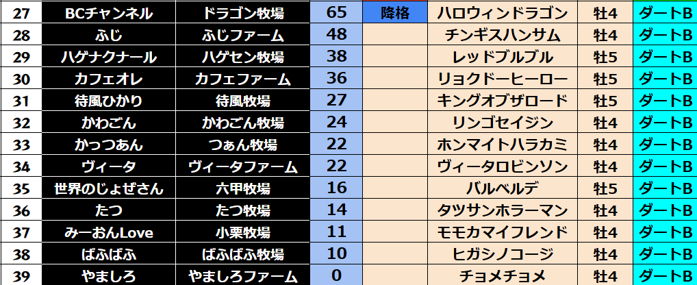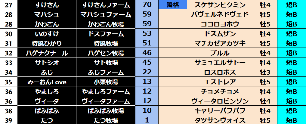 ダビスタ 【ダビスタSwitch】suke3BC season2 8月3週目 クラス振り分け確定! 今週のクラス分け発表です。 【8月3週目】 参加馬主:78名 全登録馬:301頭 ダート:75頭 長距離:75頭 中距離:75頭 短距離:...