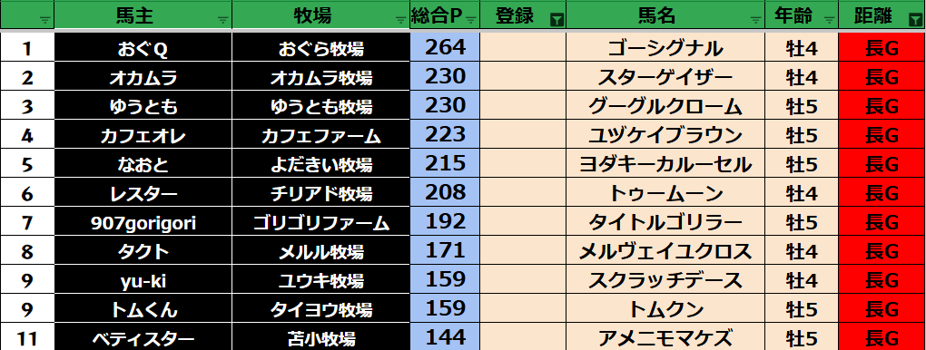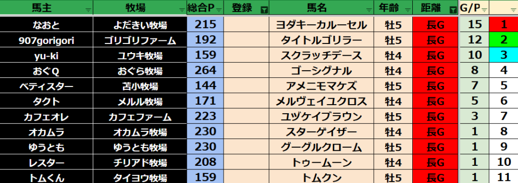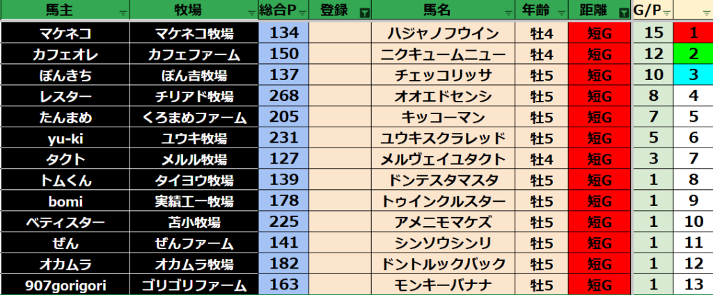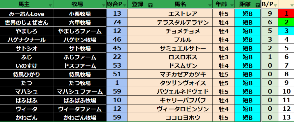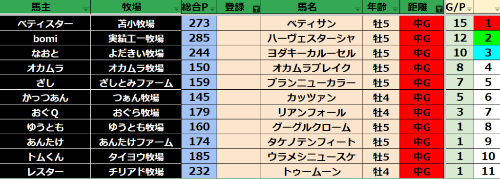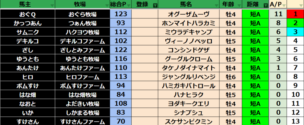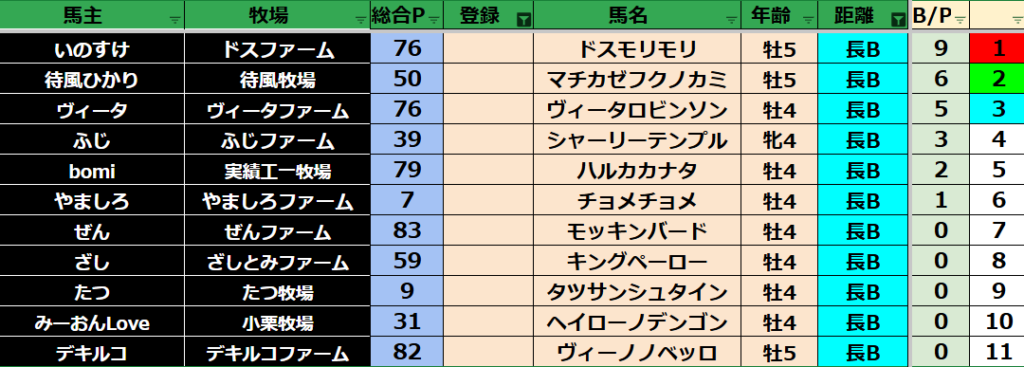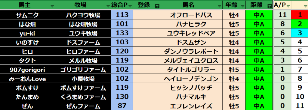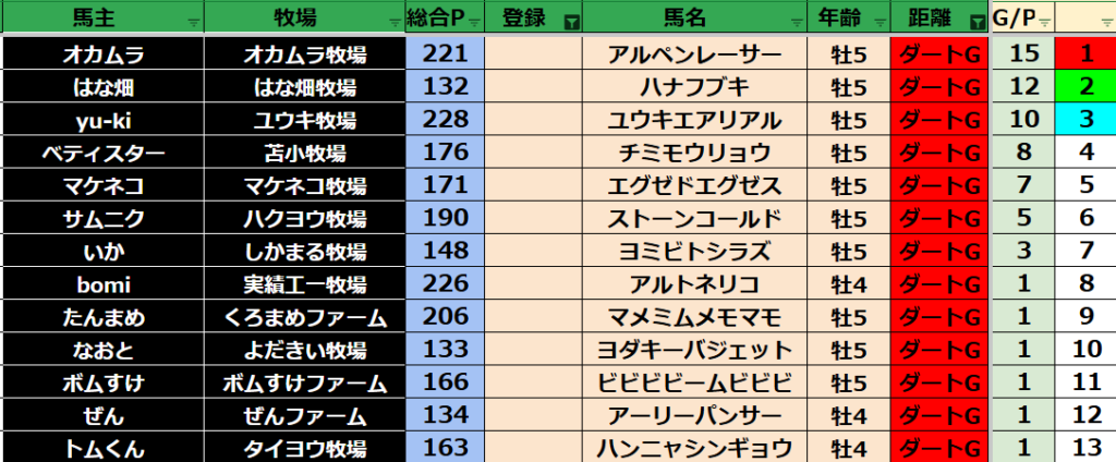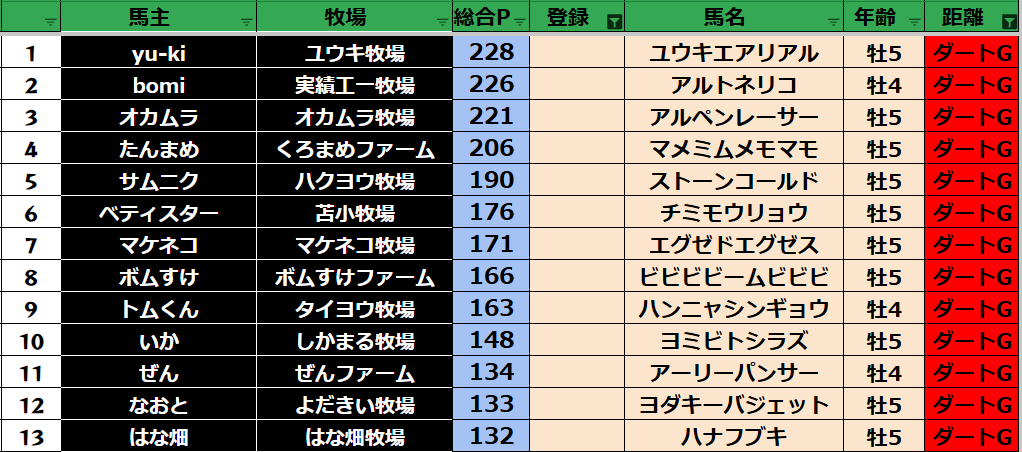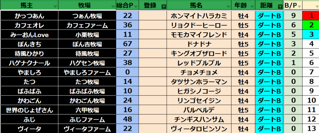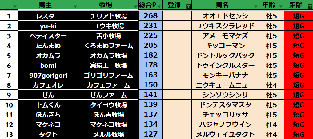ゲーム ダビスタ ドラクエ10 【ダビスタSwitch】suke3BC season5!! 8月1目 結果発表!! 2025年8月10日 2025年8月10日 Facebook postはてブLINEPocketFeedly 先週の結果の方まいります! Contents 【ダート結果】 【ダートランキング】 【短距離結果】 【短距離ランキング】 【中距離結果】 【中距離ランキング】 【長距離結果】 【長距離ランキング】 【馬主総合ランキング】 【ダビクエ的中率】 Facebook postはてブLINEPocketFeedly