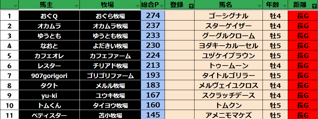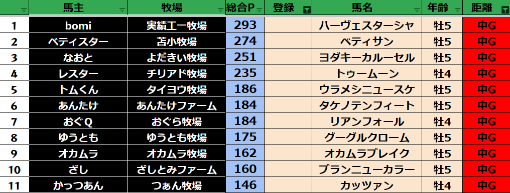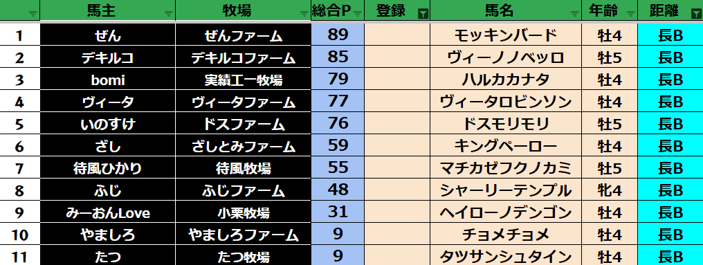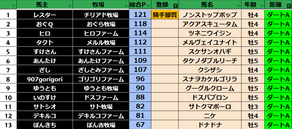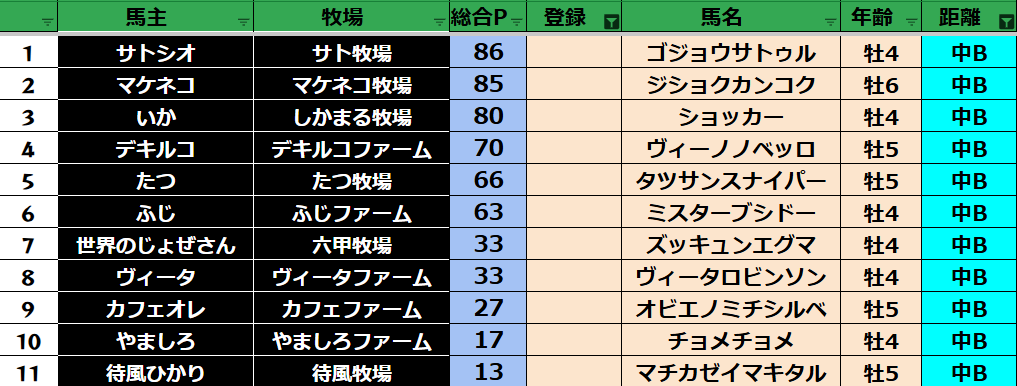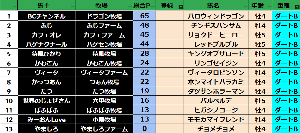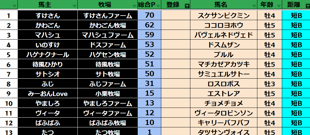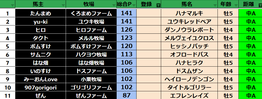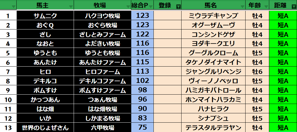 ゲーム ダビスタ 【ダビスタSwitch】suke3BC season5 8月3週目 クラス振り分け確定! 2025年8月20日 2025年8月20日 Facebook postはてブLINEPocketFeedly さぁそれでは今週の振り分けです! 参加馬主:40名 全登録馬:144頭 ダート:39頭 短距離:39頭 中距離:33頭 長距離:33頭 Contents 【ダート】 【短距離】 【中距離】 【長距離】 Facebook postはてブLINEPocketFeedly
