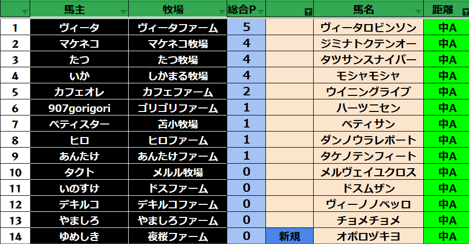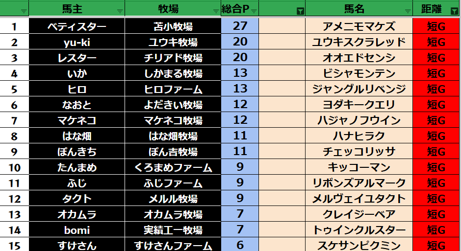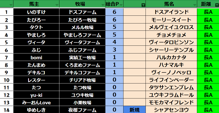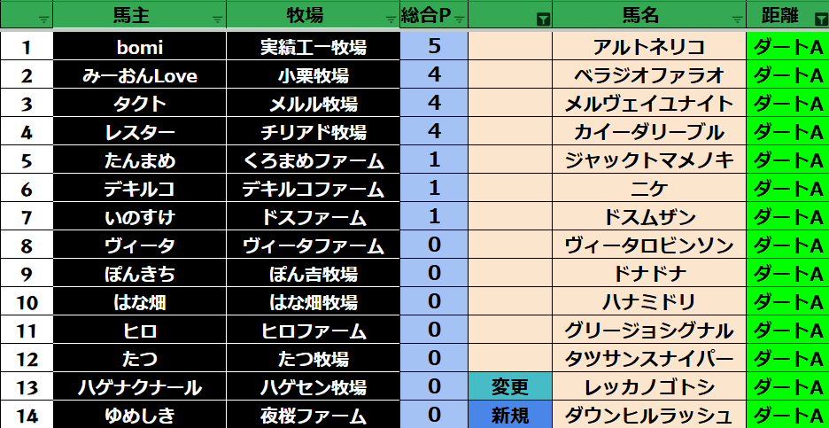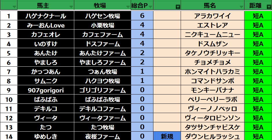 ゲーム ダビスタ 【ダビスタSwitch】suke3BC season6 1月3週目 クラス振り分け確定! 2026年1月23日 2026年1月23日 Facebook postはてブLINEPocketFeedly それでは今週の振り分けです! 参加馬主:32名 全登録馬:115頭 ダート:29頭 短距離:29頭 中距離:29頭 長距離:28頭 Contents 【ダート】 【短距離】 【中距離】 【長距離】 【ダビクエ的中率】 Facebook postはてブLINEPocketFeedly