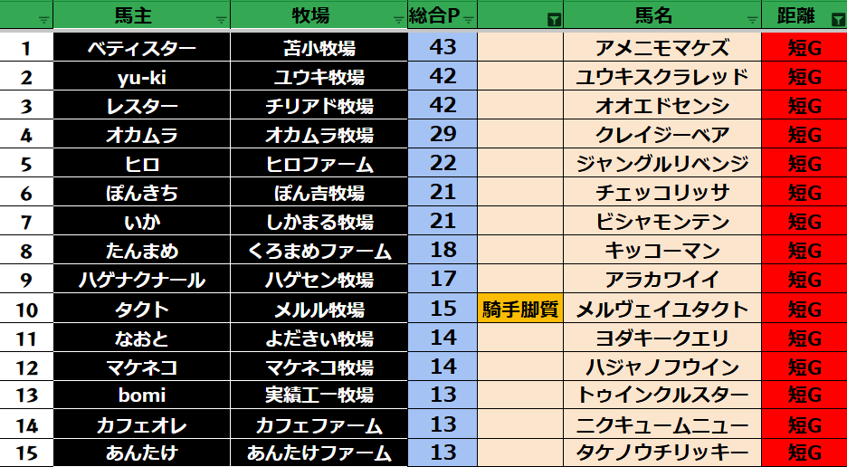 短距離:30頭