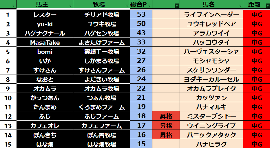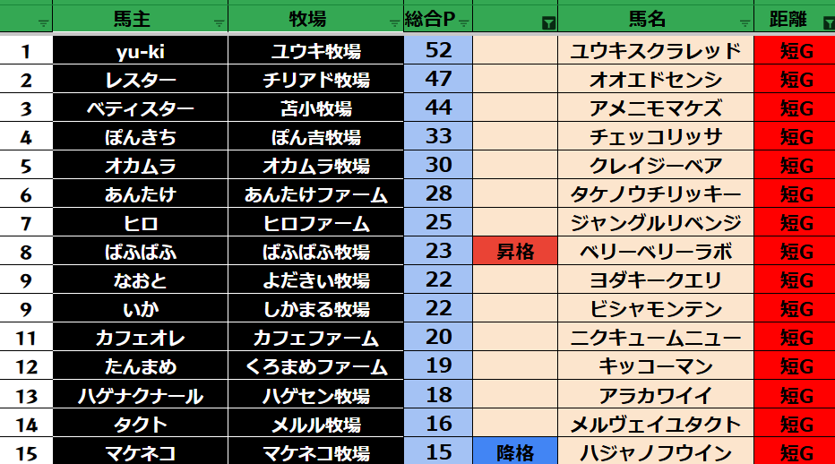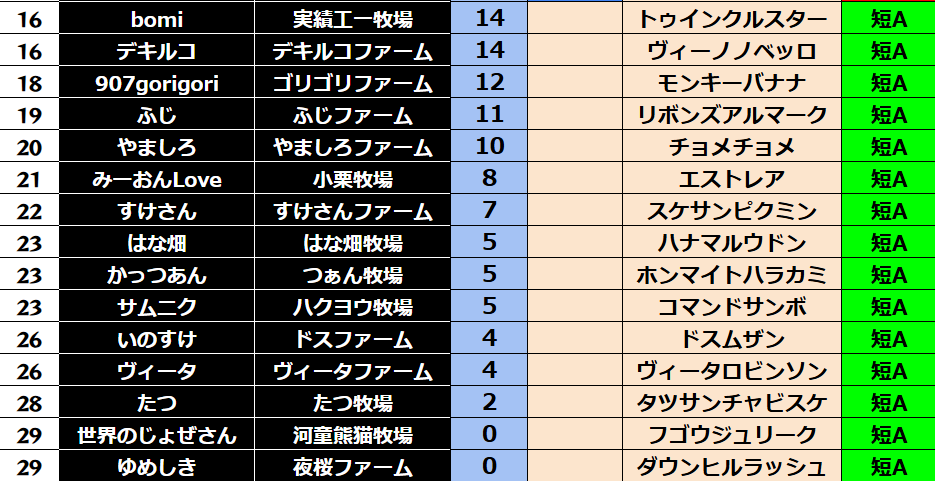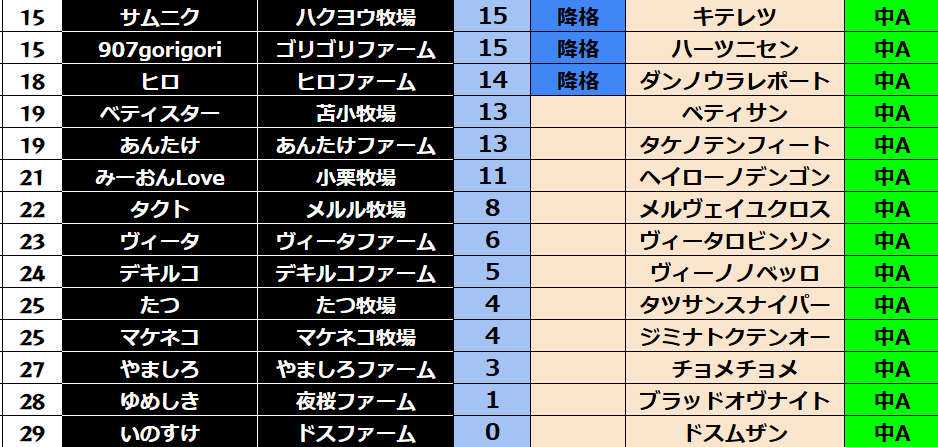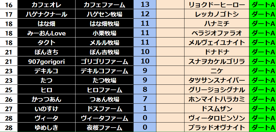 ダビスタ 【ダビスタSwitch】suke3BC season2 11月1週目 クラス振り分け確定! 今週のクラス分け発表です。 【11月1週目】 参加馬主:80名 全登録馬:311頭 ダート:77頭 長距離:77頭 中距離:78頭 短距離:...