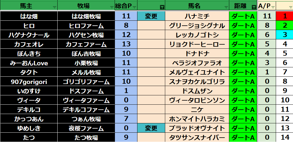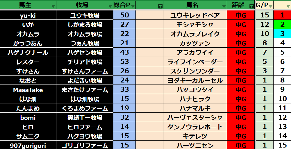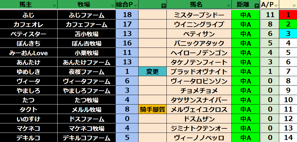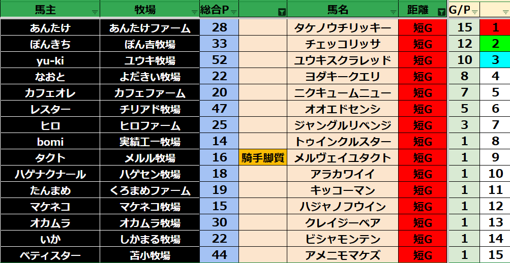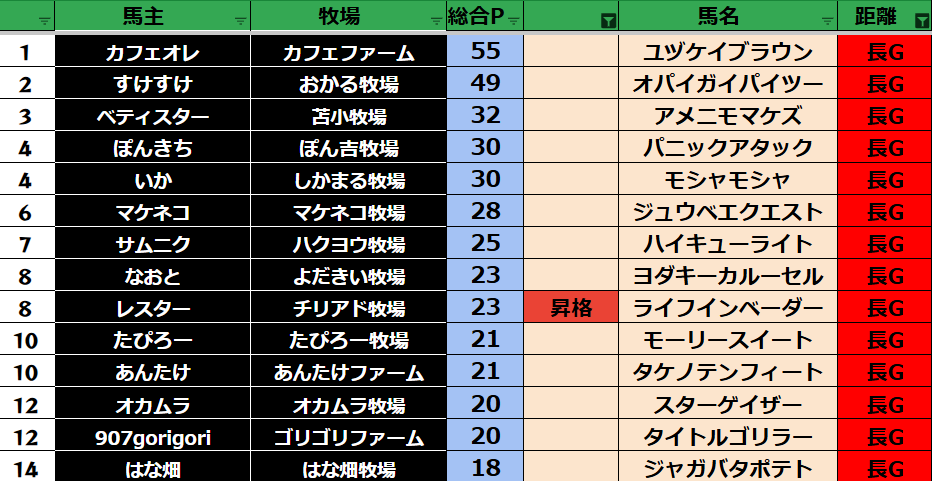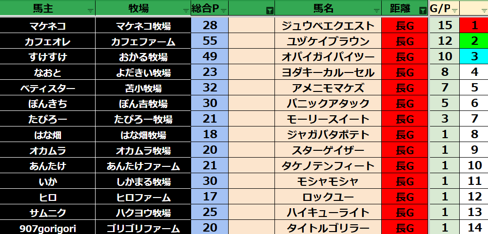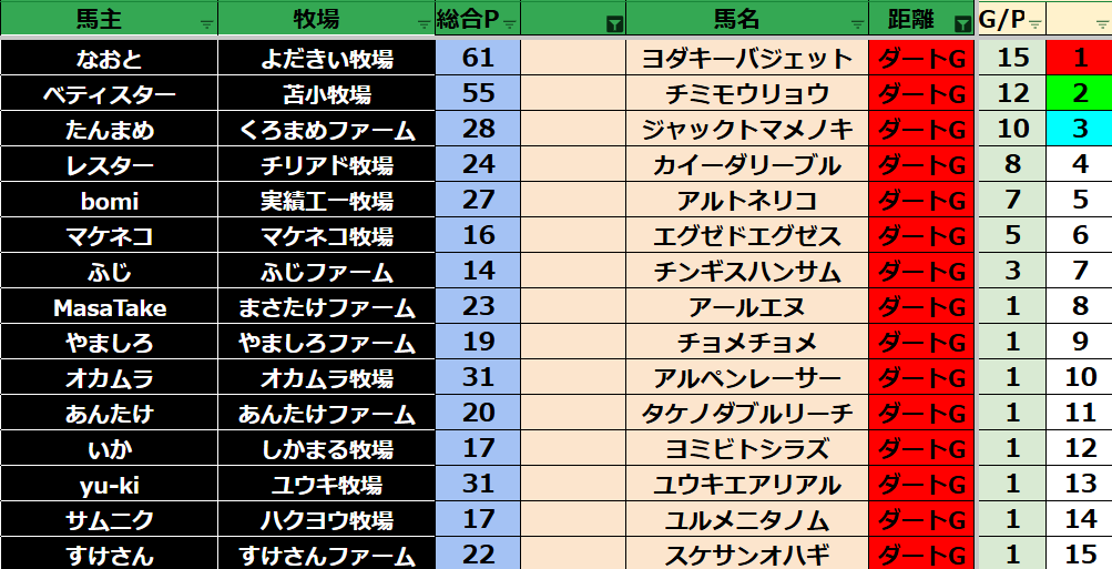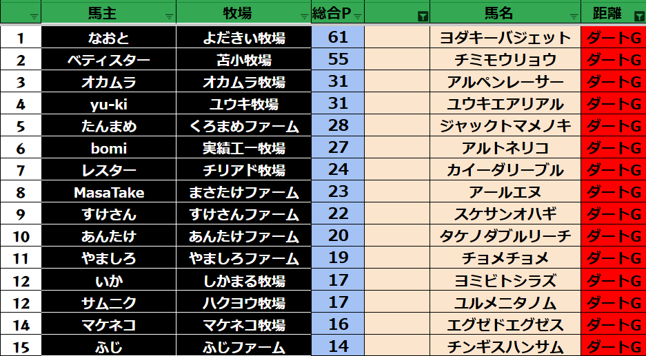 ゲーム ダビスタ 【ダビスタSwitch】suke3BC season6!! 2月1週目 結果発表!! 2026年2月9日 2026年2月9日 Facebook postはてブLINEPocketFeedly それでは先週の結果の方まいります! Contents 【ダート結果】 【ダートランキング】 【短距離結果】 【短距離ランキング】 【中距離結果】 【中距離ランキング】 【長距離結果】 【長距離ランキング】 【馬主総合ランキング】 Facebook postはてブLINEPocketFeedly
