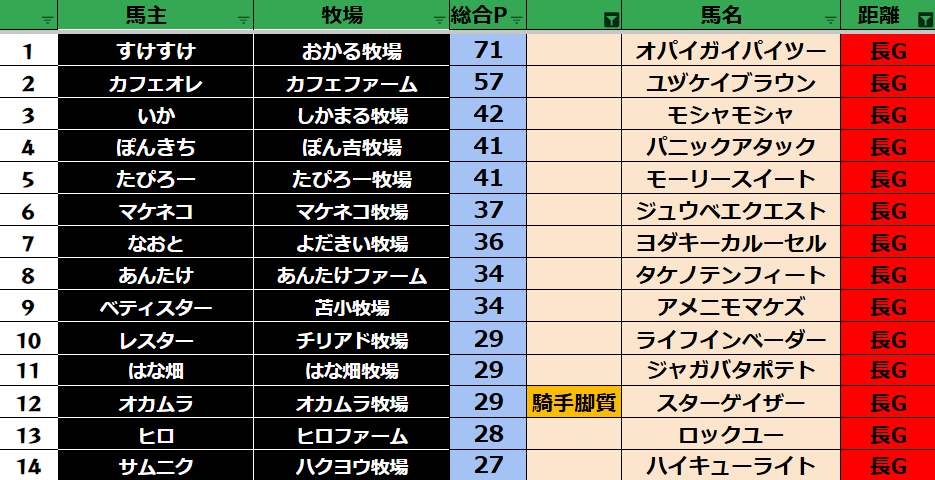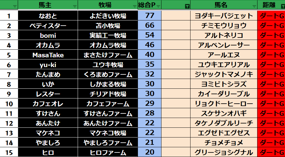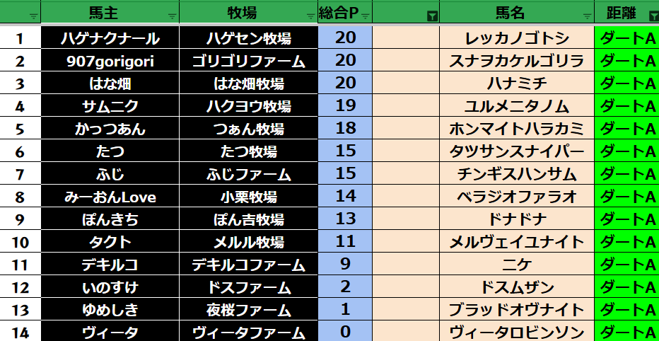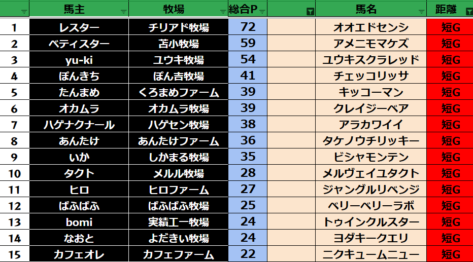ゲーム ダビスタ 【ダビスタSwitch】suke3BC season6 2月4週目 クラス振り分け確定! 2026年2月27日 2026年2月27日 Facebook postはてブLINEPocketFeedly それでは今週の振り分けです! 参加馬主:33名 全登録馬:116頭 ダート:29頭 短距離:30頭 中距離:29頭 長距離:28頭 Contents 【ダート】 【短距離】 【中距離】 【長距離】 Facebook postはてブLINEPocketFeedly