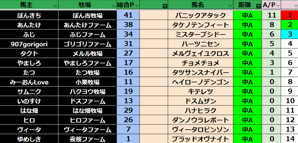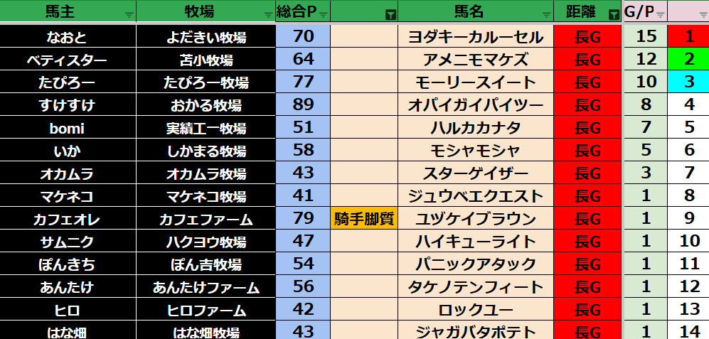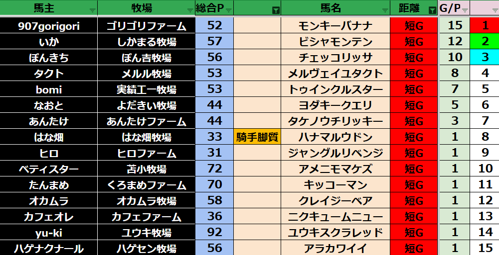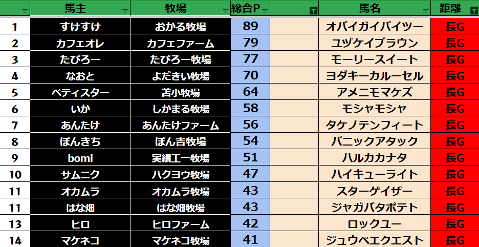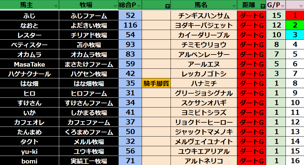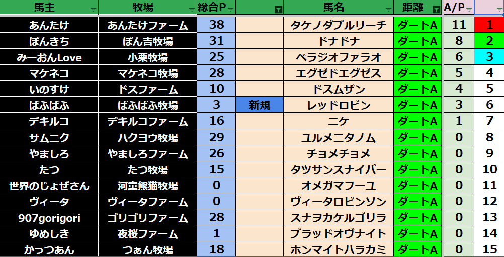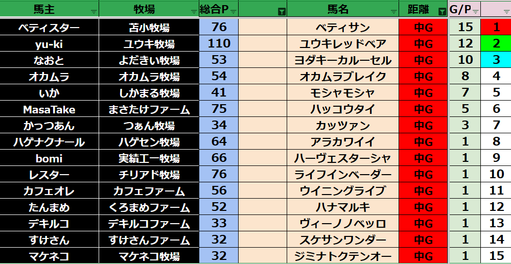 ゲーム ダビスタ 【ダビスタSwitch】suke3BC season6!! 3月3週目 結果発表!! 2026年3月23日 2026年3月23日 Facebook postはてブLINEPocketFeedly それではの結果の方まいります! Contents 【ダート結果】 【ダートランキング】 【短距離結果】 【短距離ランキング】 【中距離結果】 【中距離ランキング】 【長距離結果】 【長距離ランキング】 【馬主総合ランキング】 Facebook postはてブLINEPocketFeedly