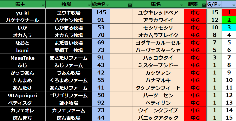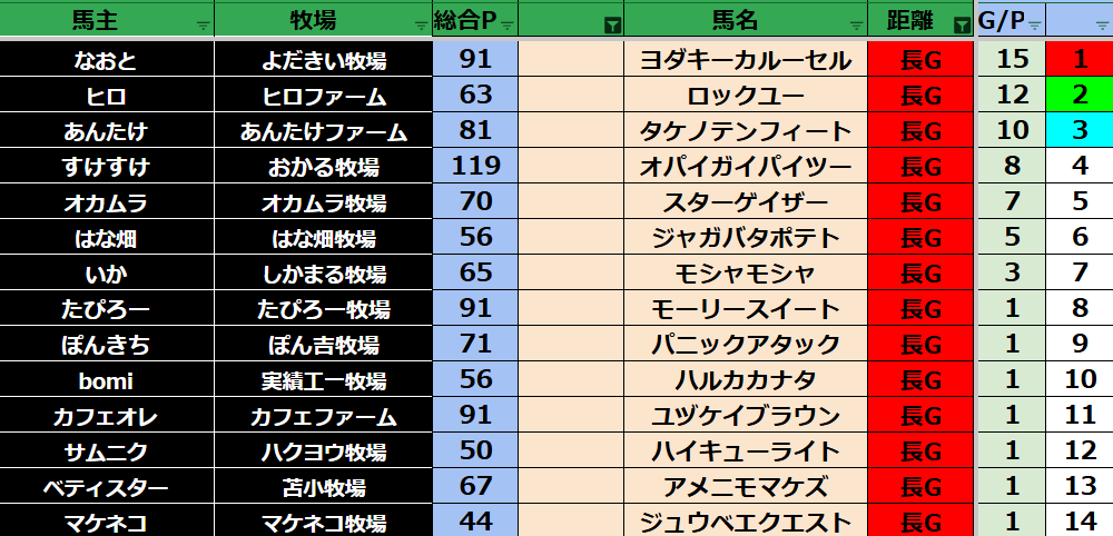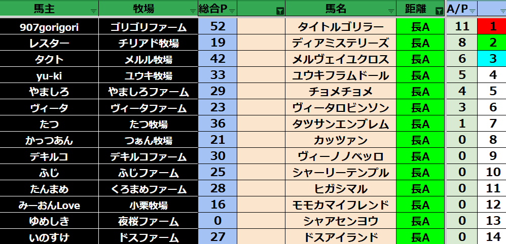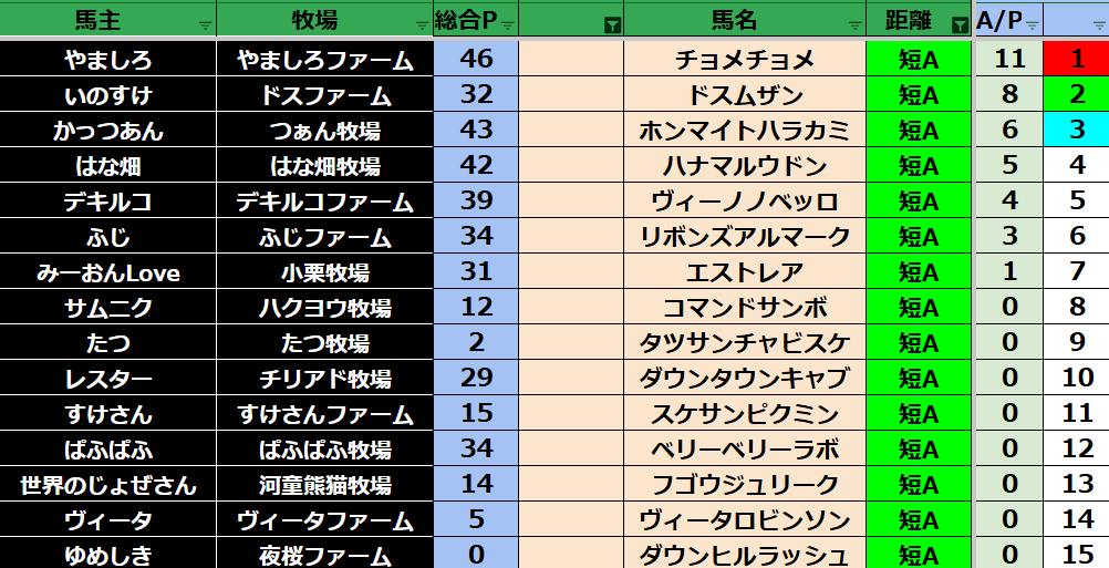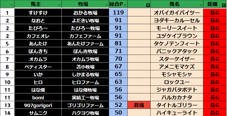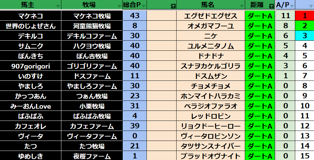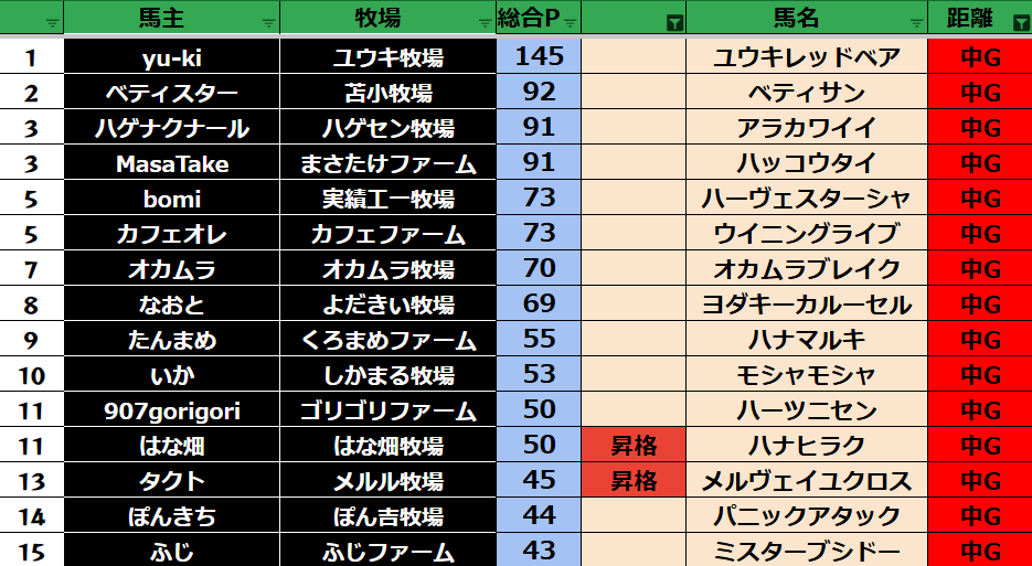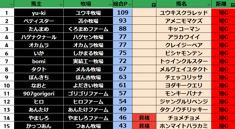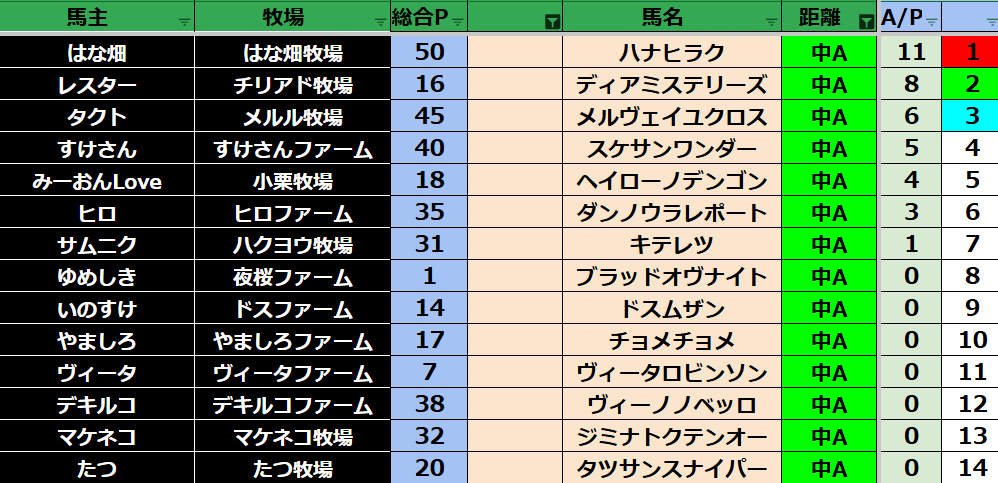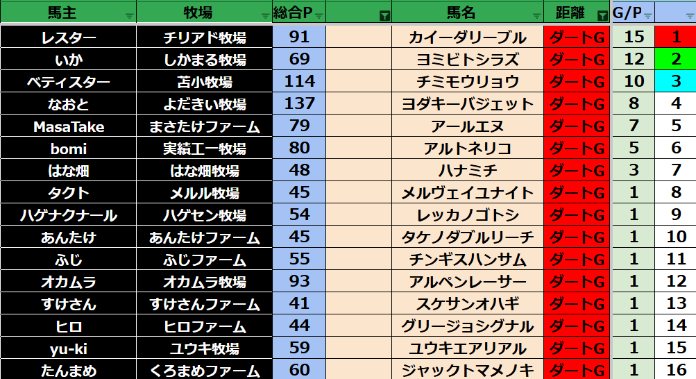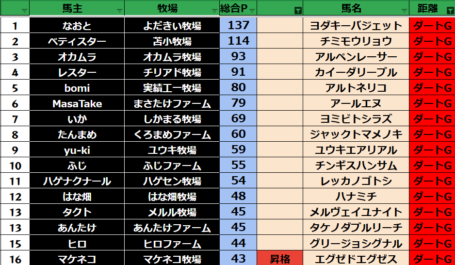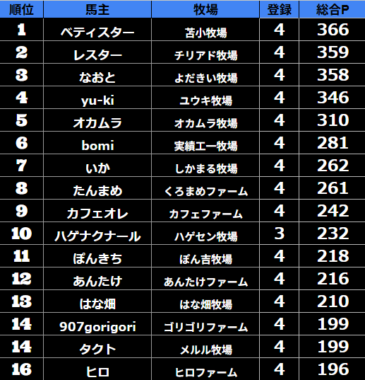 ゲーム ダビスタ 【ダビスタSwitch】suke3BC season6!! 4月2週目 結果発表!! 2026年4月13日 2026年4月13日 Facebook postはてブLINEPocketFeedly それではの結果の方まいります! Contents 【ダート結果】 【ダートランキング】 【短距離結果】 【短距離ランキング】 【中距離結果】 【中距離ランキング】 【長距離結果】 【長距離ランキング】 【馬主総合ランキング】 Facebook postはてブLINEPocketFeedly