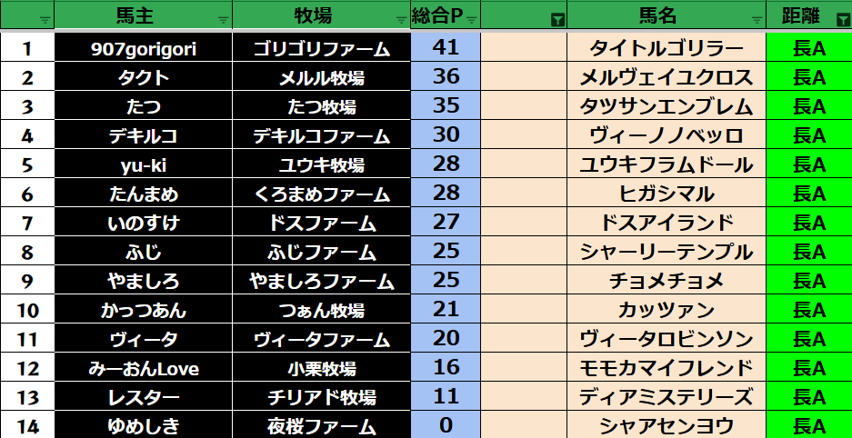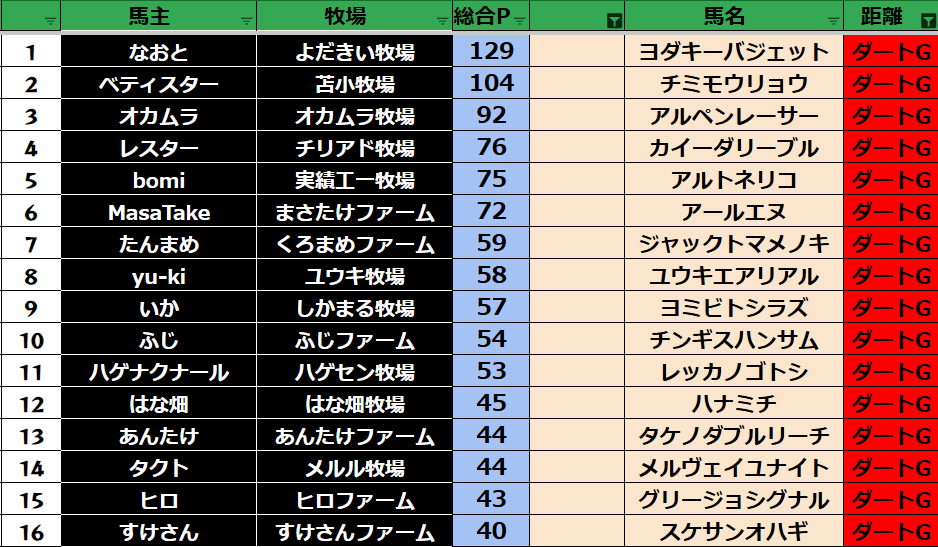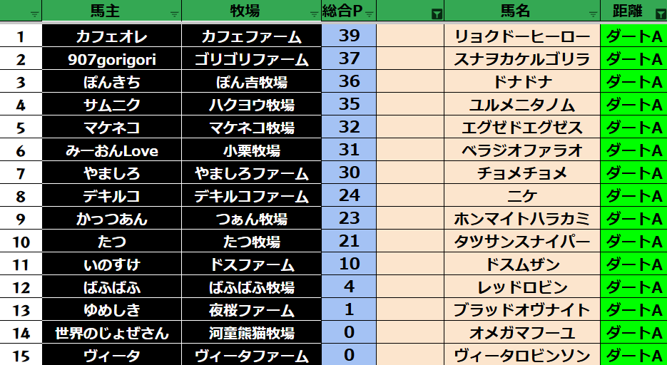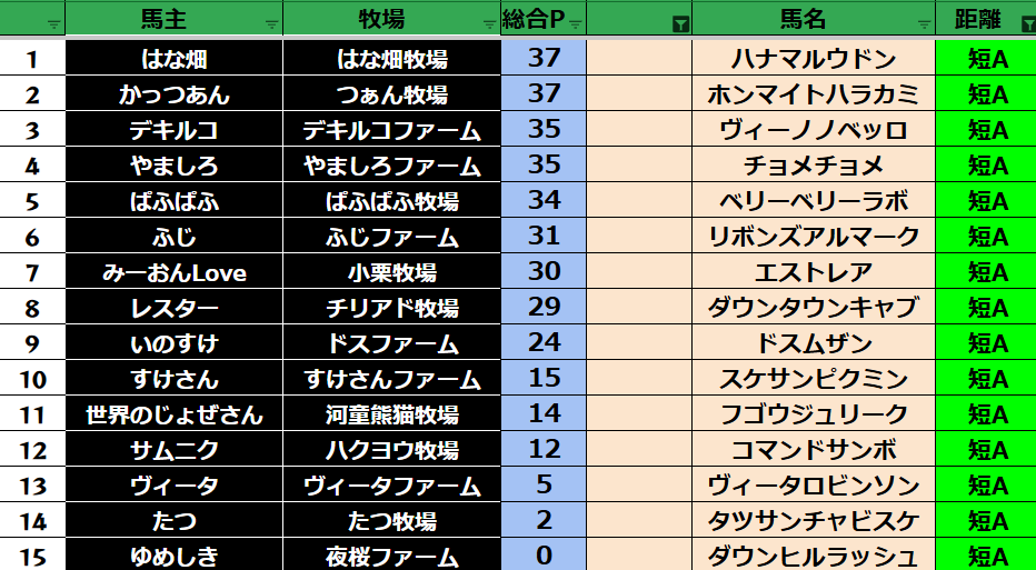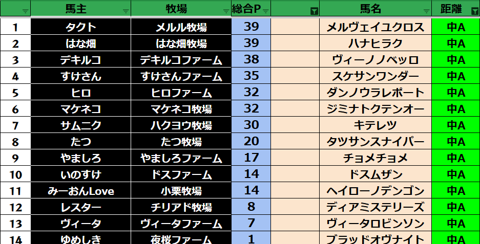 ゲーム ダビスタ 【ダビスタSwitch】suke3BC season6 4月2週目 クラス振り分け確定! 2026年4月10日 2026年4月10日 Facebook postはてブLINEPocketFeedly それでは今週の振り分けです! 参加馬主:33名 全登録馬:118頭 ダート:31頭 短距離:30頭 中距離:29頭 長距離:28頭 Contents 【ダート】 【短距離】 【中距離】 【長距離】 Facebook postはてブLINEPocketFeedly
