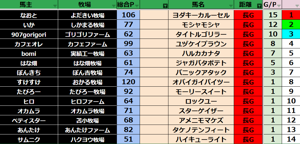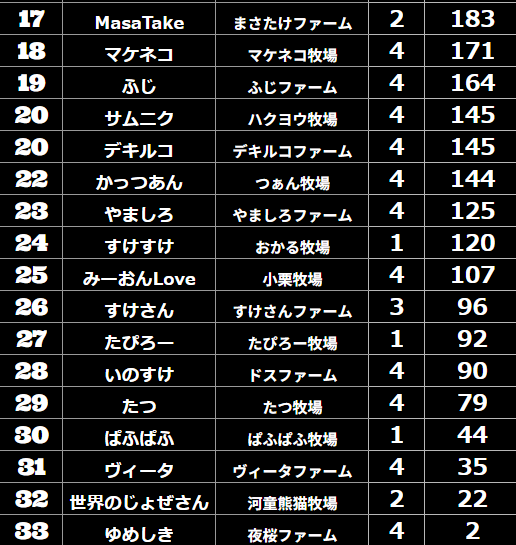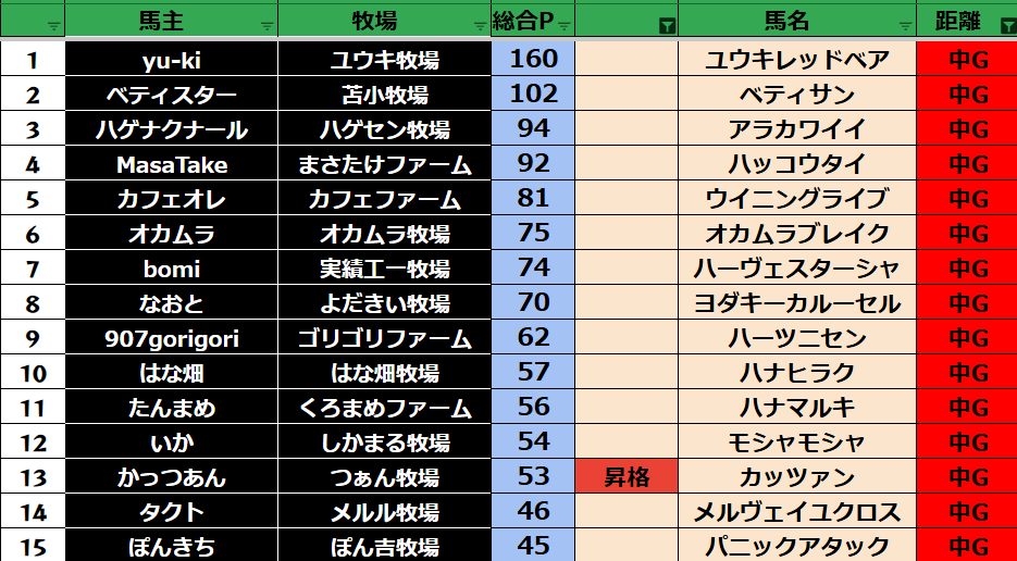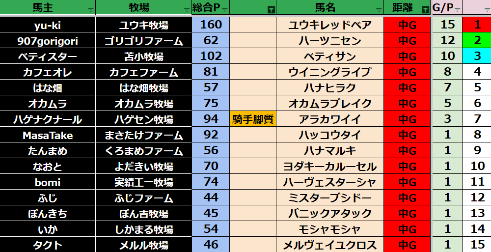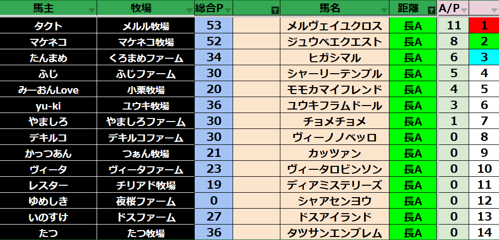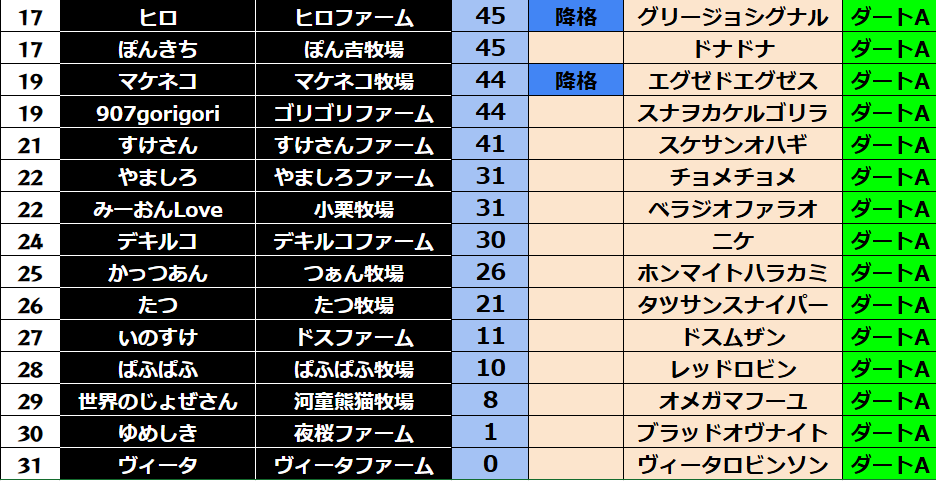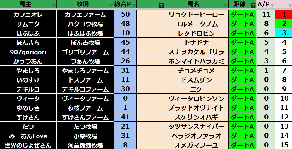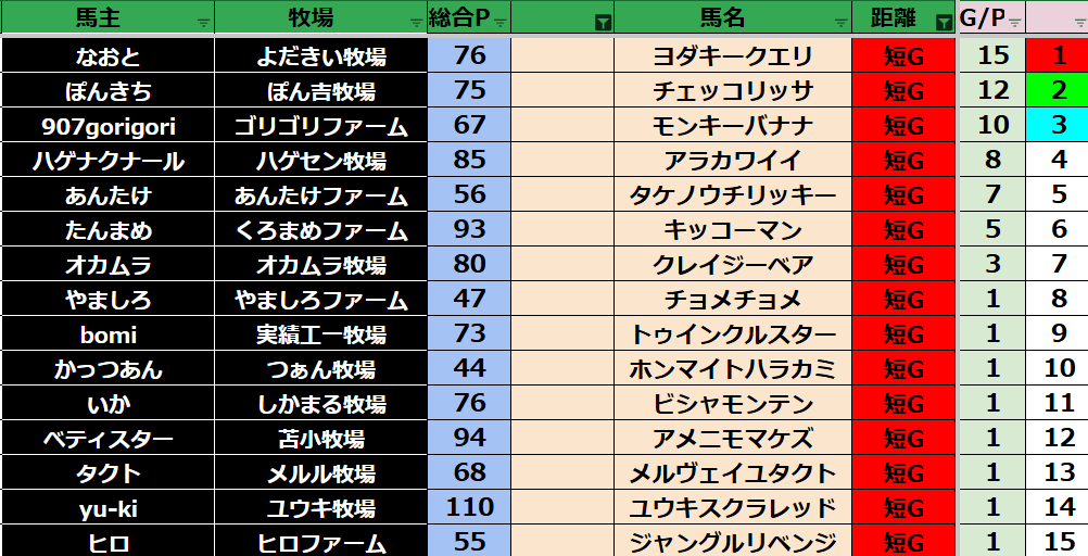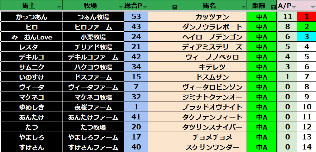ダビスタ 【ダビスタSwitch】suke3BC season2 10月3週目結果発表! 今週もご視聴ありがとうございました! それでは10月3週目の結果発表です! 【短距離結果】 【短距離ランキング】 【中距離結果】 【...