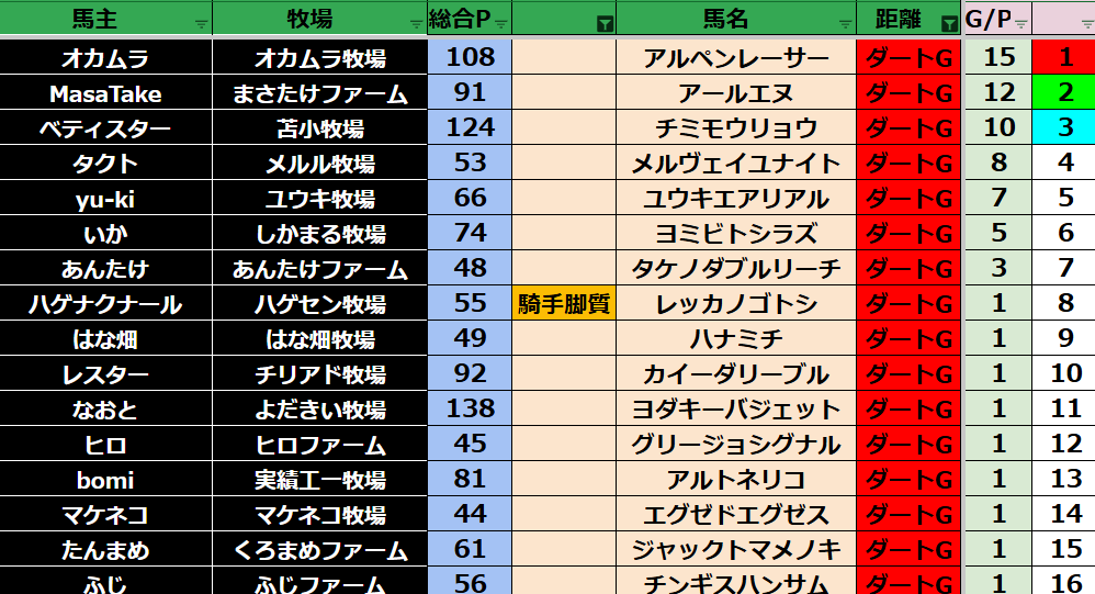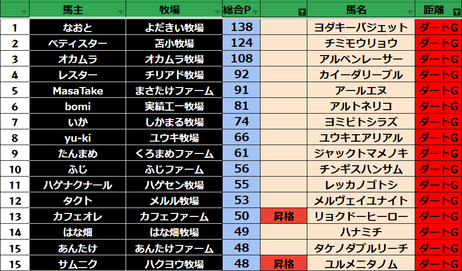 ゲーム ダビスタ 【ダビスタSwitch】suke3BC season6!! 4月3週目 結果発表!! 2026年4月18日 2026年4月18日 Facebook postはてブLINEPocketFeedly それではの結果の方まいります! Contents 【ダート結果】 【ダートランキング】 【短距離結果】 【短距離ランキング】 【中距離結果】 【中距離ランキング】 【長距離結果】 【長距離ランキング】 【馬主総合ランキング】 Facebook postはてブLINEPocketFeedly