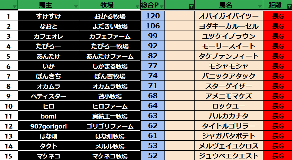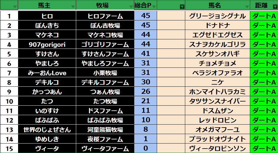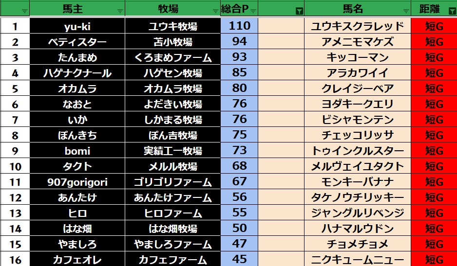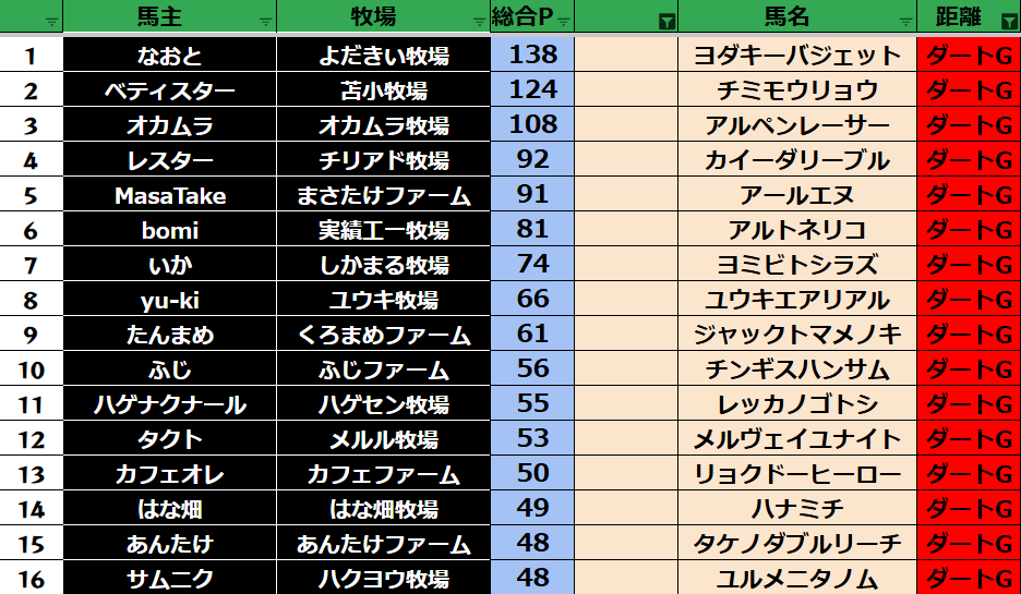 Uncategorized 【ダビスタSwitch】suke3BC season6!! 予選2週目 結果発表!! それでは予選2週目の結果発表です! 【ダート結果】 【ダートランキング】 【短距離結果】 【短距離ランキング】 【中距離結果】 【中距...