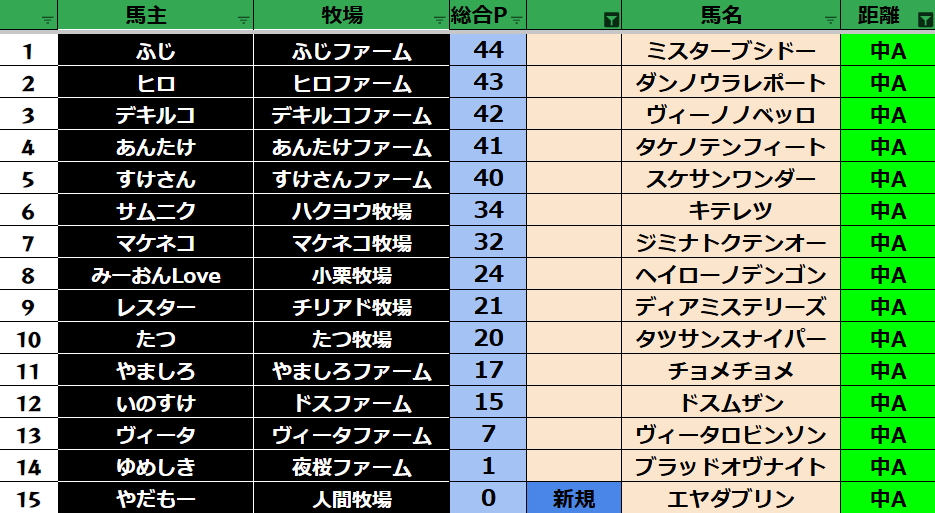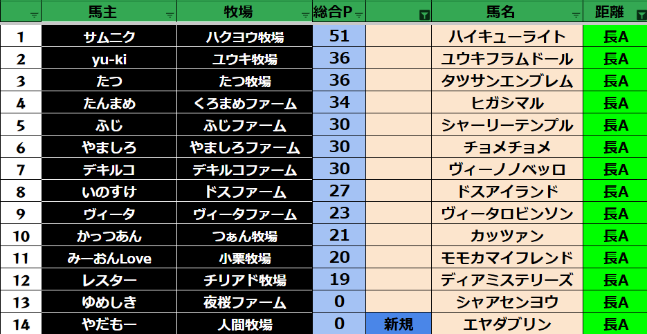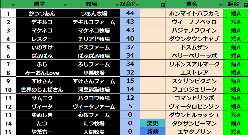 ダビスタ 【ダビスタSwitch】suke3BC season5 3月4週目 クラス振り分け確定! 3月ラストになります! 参加馬主:35名 全登録馬:127頭 ダート:34頭 短距離:34頭 中距離:29頭 長距離:30頭 【ダート】 【...