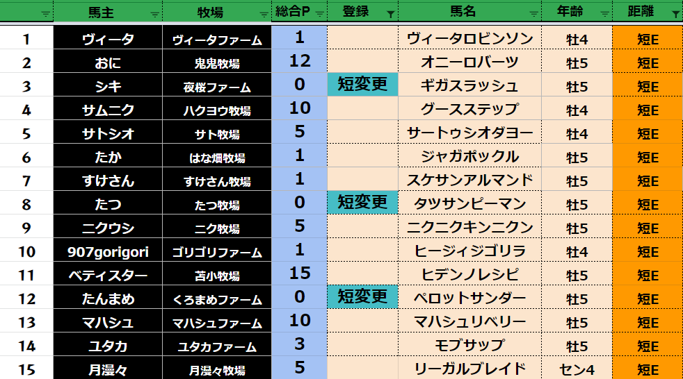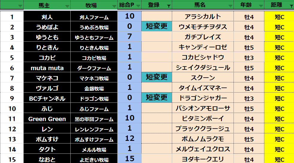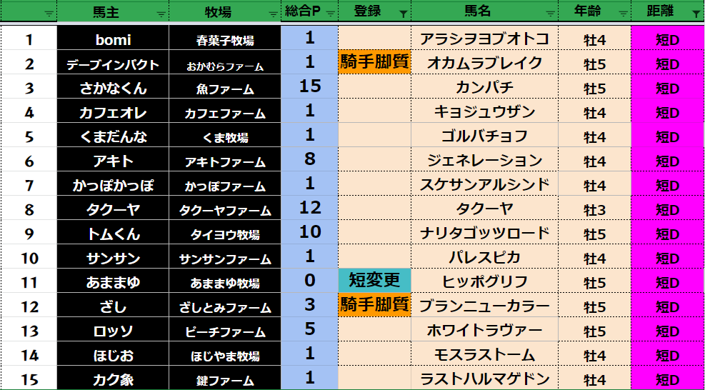 短距離:77頭