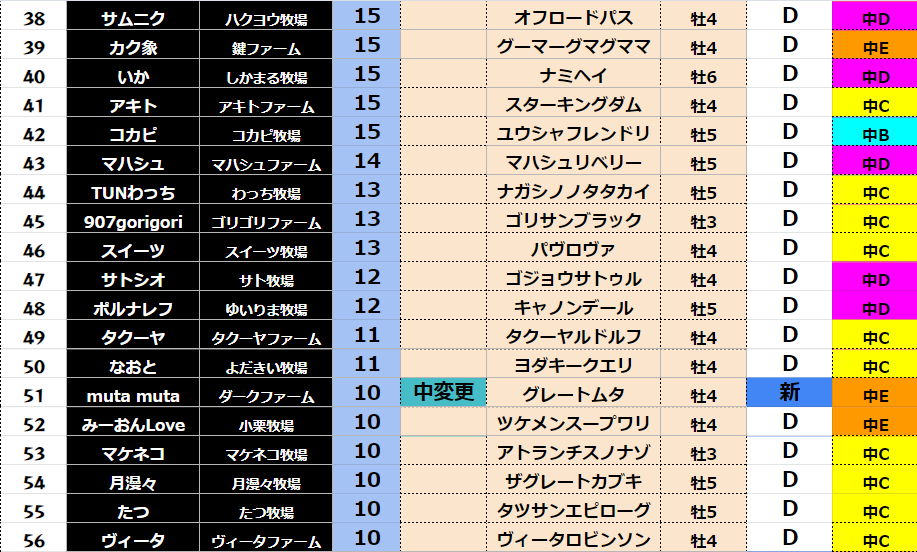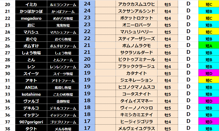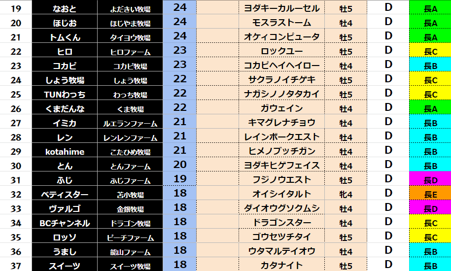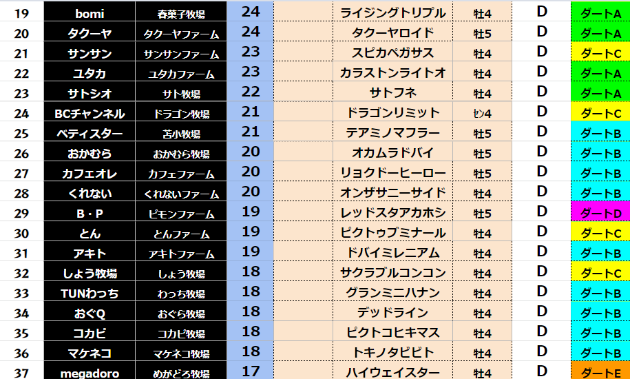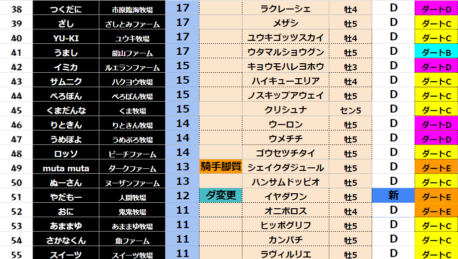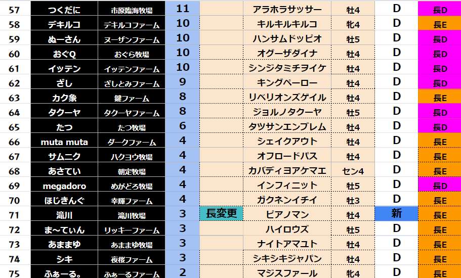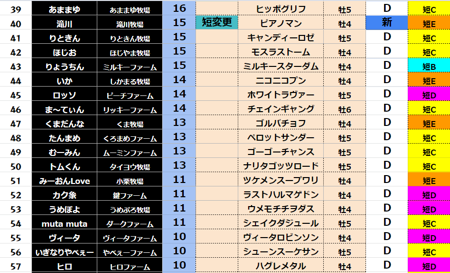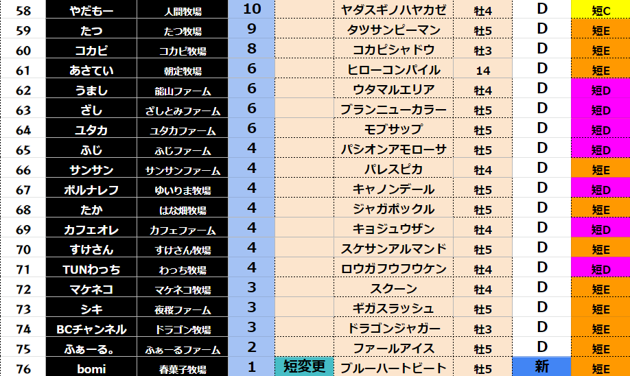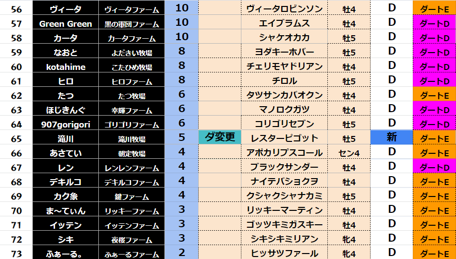 ダビスタ 【ダビスタSwitch】suke3BC season4 7月2週目 クラス振り分け確定! 遅くなりました! 7月2週目のクラス分けになります! 【ダート】 【短距離】 【中距離】 【長距離】...