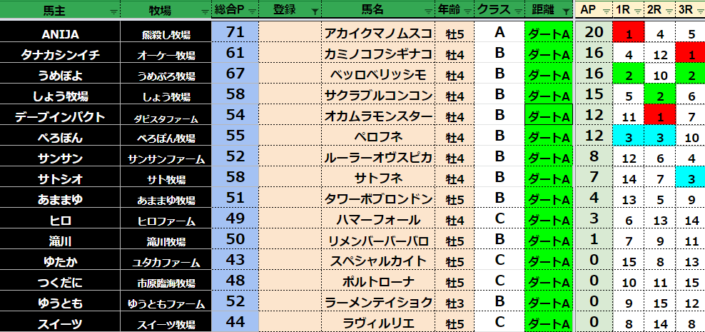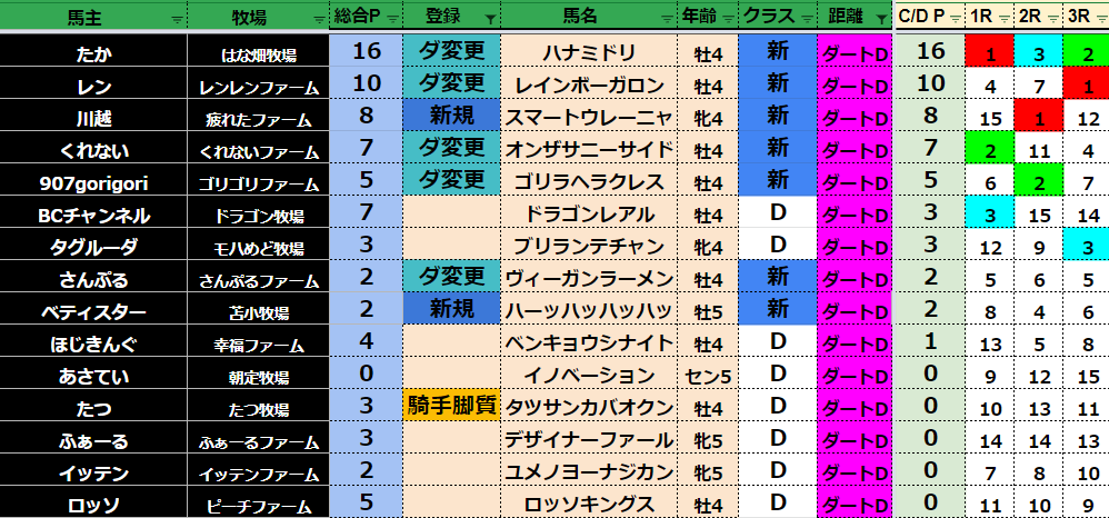 ダート部門優勝はたかさんの新規登録馬ハナミドリ!16pt獲得!