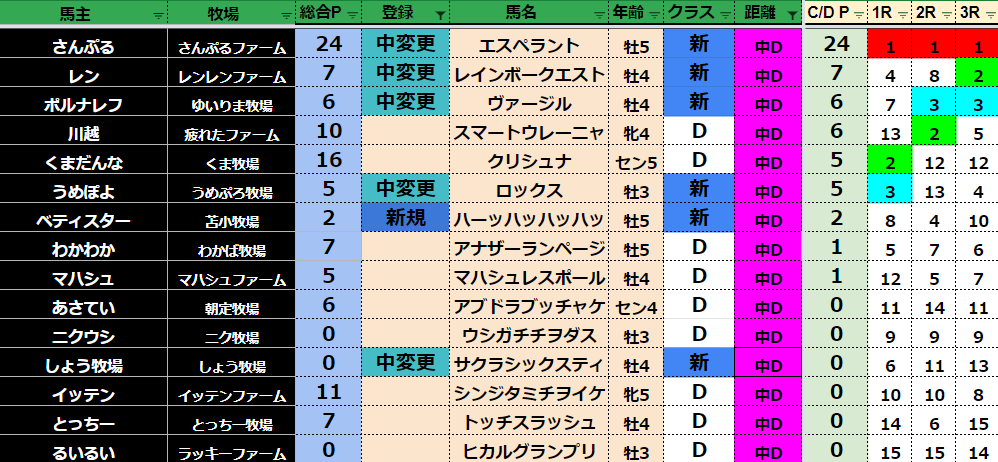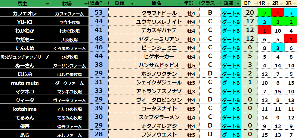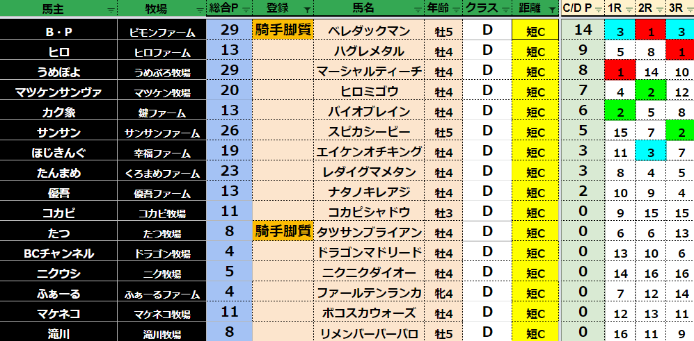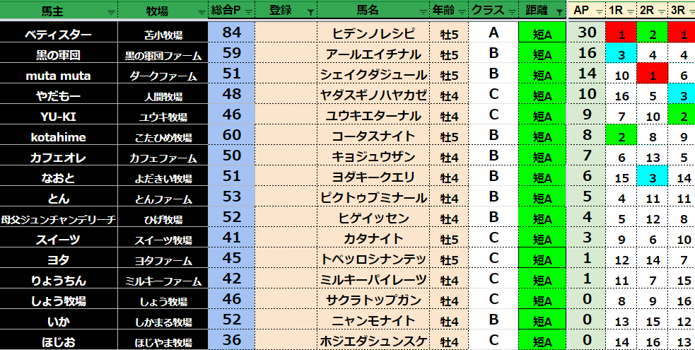 短距離部門優勝はベティスターさんのヒデンノレシピ!なんと1・2・1着の30pt!これは大変な成績!2タテの更に2着が一回という!これは次週はGクラスに上がりますねー、そしてGクラスでどのような活躍をしてくれるのか!2位は黒の軍団さんのアールエイチナル!3・4・4着で16pt獲得!全レース掲示板の安定した走りで堂々2位!3位はムタさんでシェイクダジュール!10・1・6着の14pt獲得。唯一ヒデンノレシピに泥をつけて3位に入線!