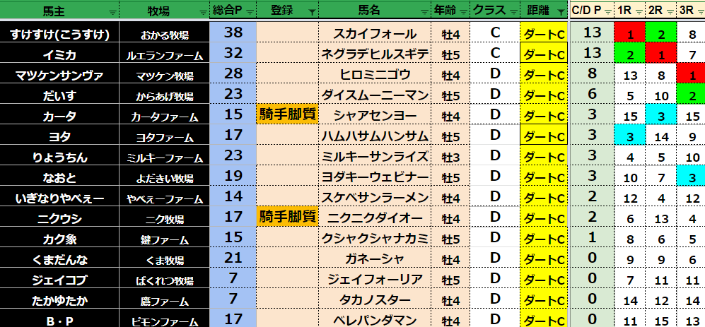 総合順位はご覧の通り80p台が5頭おり大混戦ムード!現時点では今週3位に入ったサトシオさんのサートゥシオダヨーとイミカさんのアカクカスムユウヒが88ptで1位となっています。ただほぼ横一線の状態、さすがは短距離部門と言ったところでしょうか!