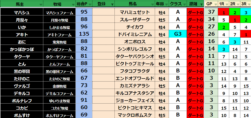 ダート部門はマハシュさんのマハミュゼットが優勝!1・2・3着で全レース複勝圏内!37p獲得!距離が違うなかこの安定した着順はお見事としか言いようがございません!今後の活躍も期待できそうです!2位には月漫々さんのスルーザダーク!5・1・2着の全レース掲示板内!34p獲得!このお馬さんも安定した成績!更に後日開催されたダビクエでも優勝をしました!イイデスネエ~!3位はいかさんのチイカワ!どっかのマスコットの名前で聞いたことあるような名前なんですが成績は5・1・2着!かわいいだけでなく強いと言うのは何も言うことが無いのであります!獲得Pは27p!