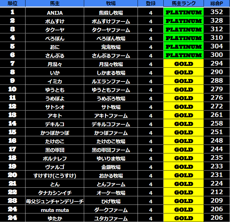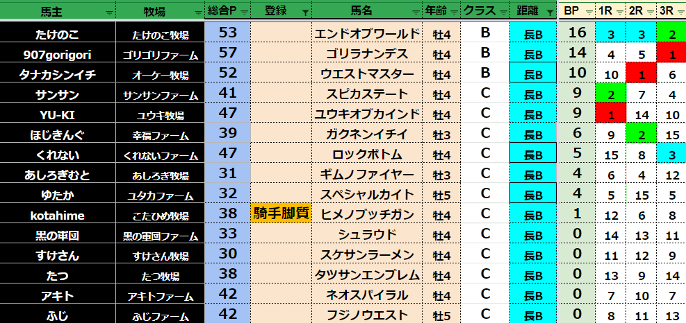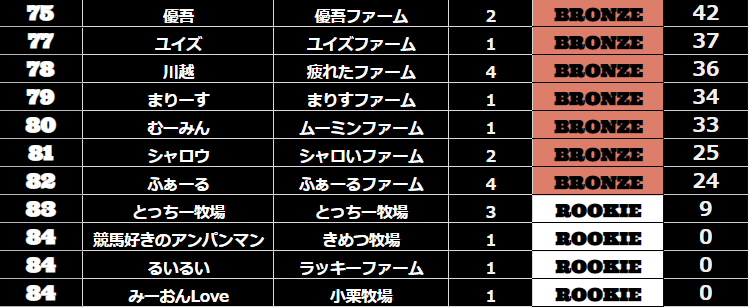 長距離部門優勝はたけのこさんのエンドオブワールド!3・3・2着の16pt獲得!2位はgorigoriさんのゴリラナンデス!4・5・1着の14pt獲得!上位2頭はとても安定した成績だ!昇格は間近かもしれない!3位はタナカシンイチさんのウエストマスター!10・1・6着で10pt獲得!