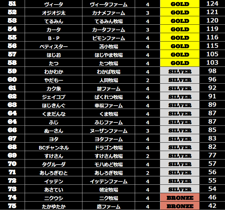 総合順位の方は1位はボムすけさんのボムノダガコトワルです!頭一つ出てる感じですが今週はいまいち成績を残すことができなかったためその差は僅かとなっています。来週は順位が変動してしまうのか!?