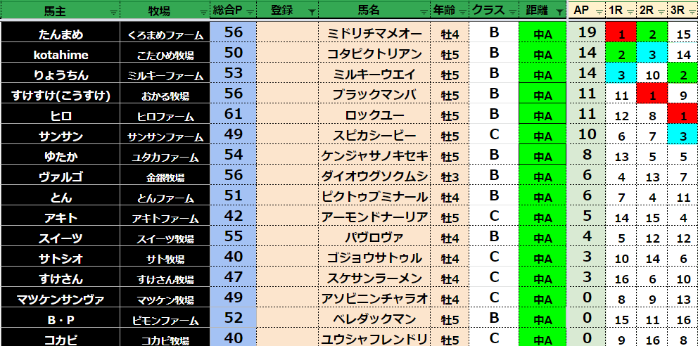 中距離部門優勝はたんまめさんのミドリチマメオー!1・2・15着の19pt獲得!最終レースは着外に沈んでしまったが前2レースが上位入線で堂々優勝した!2位はこたひめさんのコタピクトリアン!2・3・14着の14ptとりょうちんさんのミルキーウェイ!3・10・2着で同点14pt!中距離は上位入線の馬が皆1回凡走するという面白い結果になったw