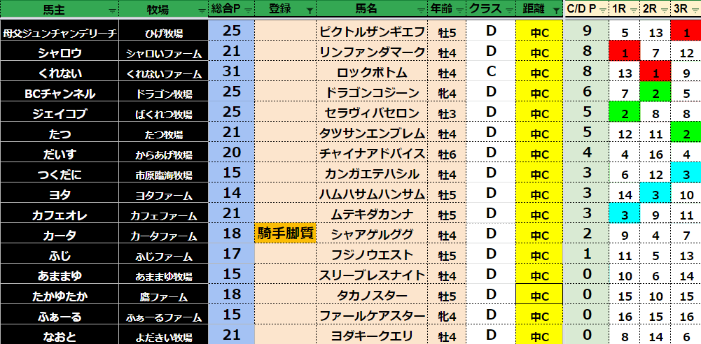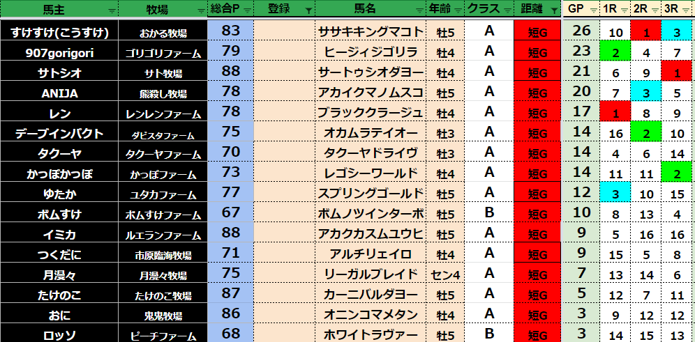 短距離部門はすけすけさんのササキキングマコト!10・1・3着の26pで早々の1位!個人的にはどっかのプロレスラーの名前かなって感じてますwww絶対違うんだろうけど。かkぅ馬の結果見ても複勝圏内2回入っているのは当馬だけ!ここではつよい活躍をしてきました!2位はgorigoriさんのヒージィジゴリラ!2・4・7着の23p獲得!最終の3Rでの着外が非常に悔やまれる結果となってしまいました。これが掲示板内なら優勝も見えていたところ。とても惜しい2位です!3位はサトシオさんのサートゥシオダヨー!6・9・1着の21p獲得!最終3レースで1着を取り3位に浮上した!現状短距離総合1位のお馬さんです!ここでも安定した順位、これからも楽しみです!