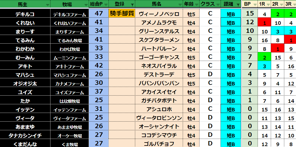 短距離部門優勝はデキルコさんのヴィーノノベッロ!4・2・2着の15pt獲得!2位はくれないさんのアメノムラクモ1・10・4着で12pt獲得!3位はマリースさんでグリーンステルス!10・3・3着10pt獲得だ!