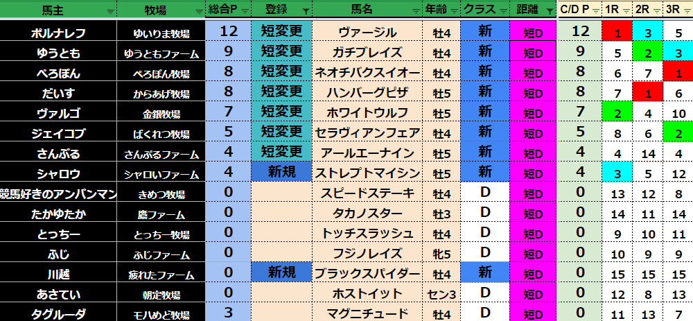 短距離部門優勝はポルナレフさんの新規登録馬ヴァージル!12pt獲得!