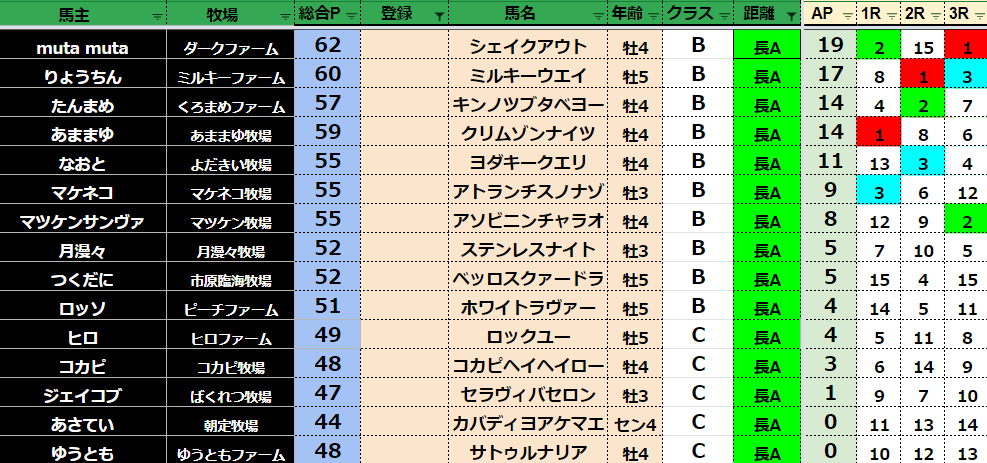 長距離部門優勝はムタさんのシェイクアウト!2・15・1着の19pt獲得!2レース目はいまいちな成績だったが他2レースで連対したため優勝となった!2位はりょうちんさんのミルキーウェイ!8・1・3着の17pt獲得だ!あと少しのところで優勝を逃したのは悔しい!3位は2頭でたんまめさんのキンノツブタベヨーとあままゆさんのクリムゾンナイツ!ともに14pt獲得!