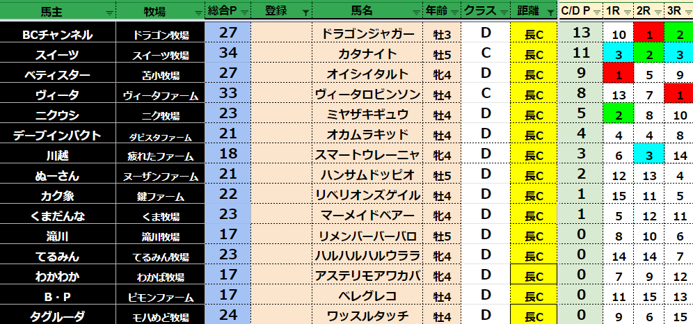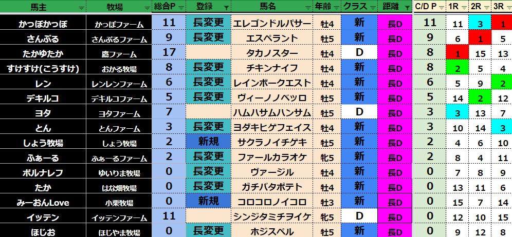 長距離部門優勝はかっぽさんの新規登録馬エレゴンドルパサー!11pt獲得!