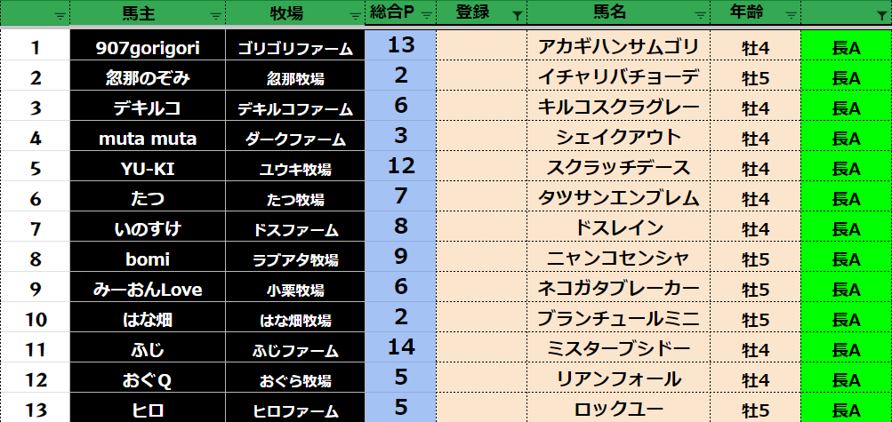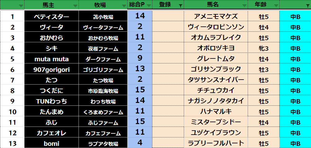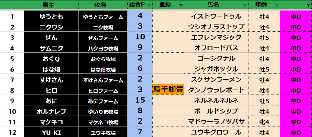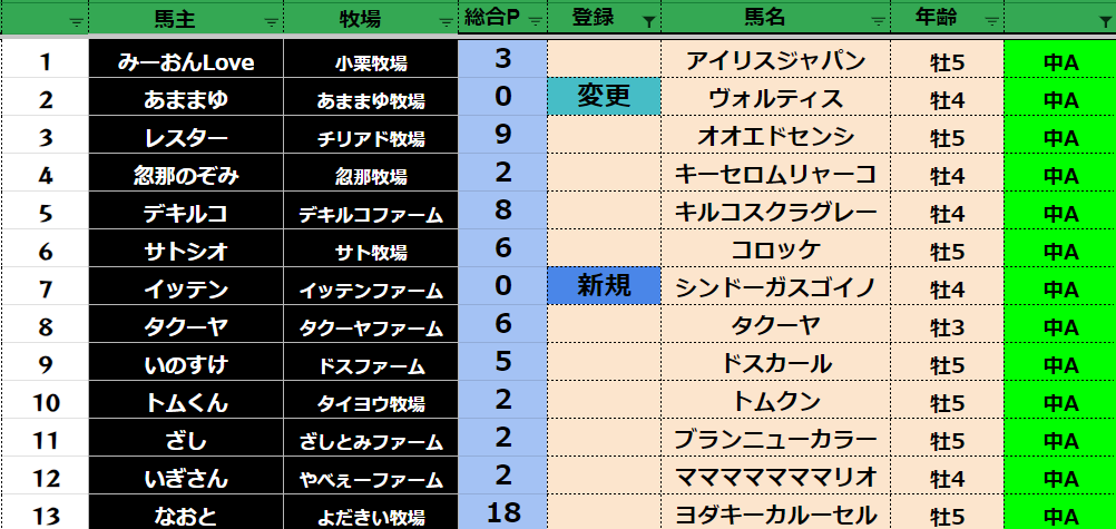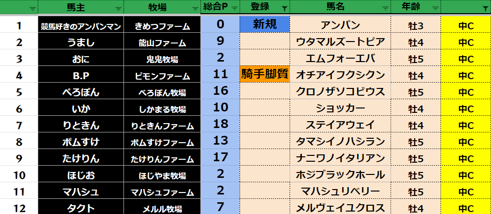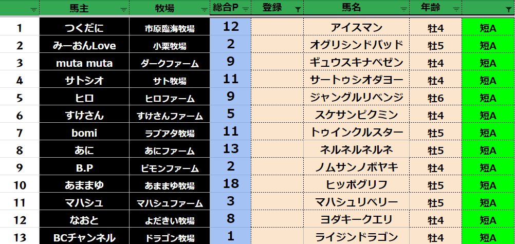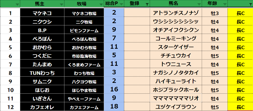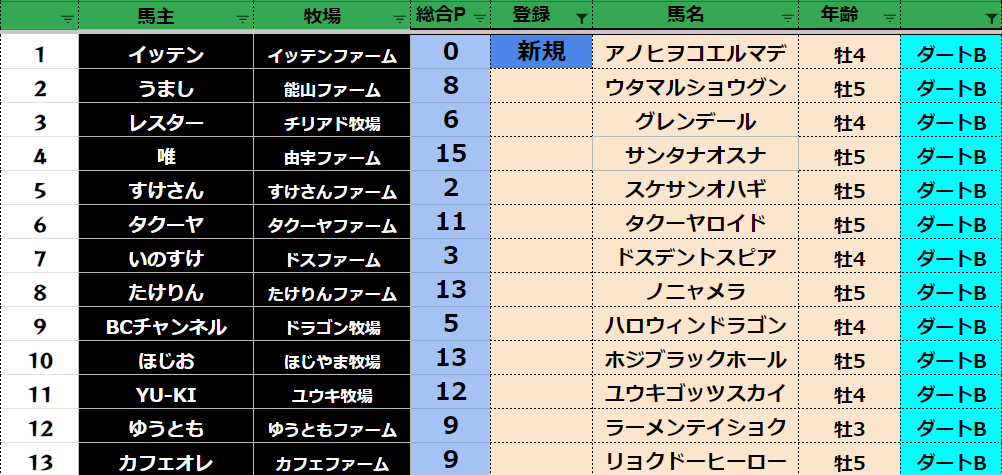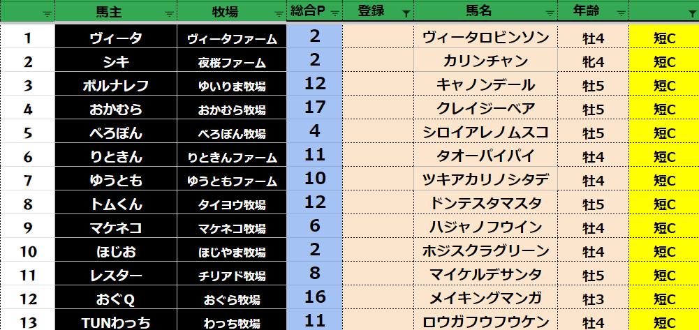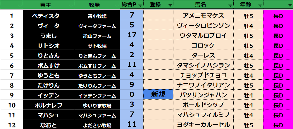 参加馬主:52名 全登録馬:202頭