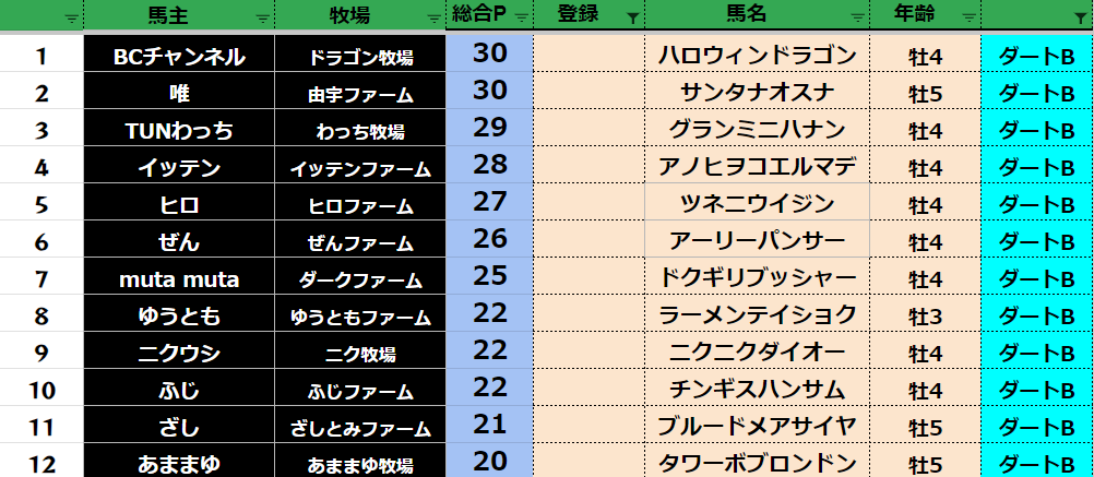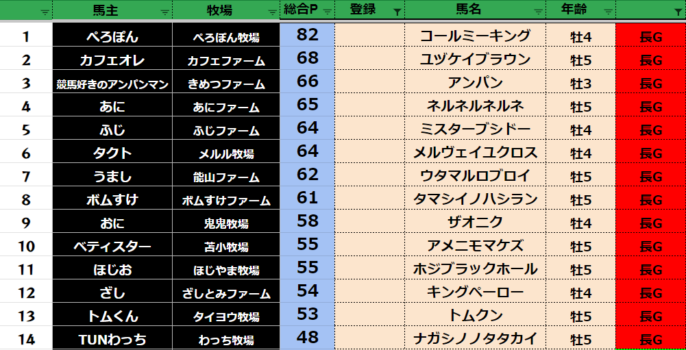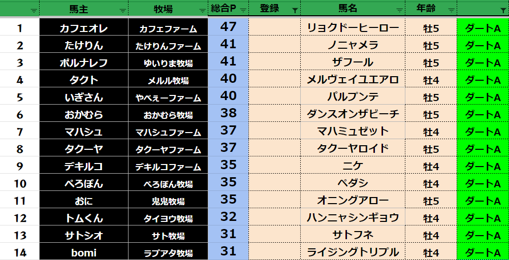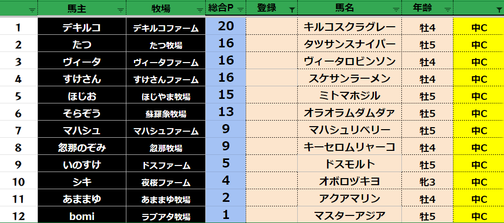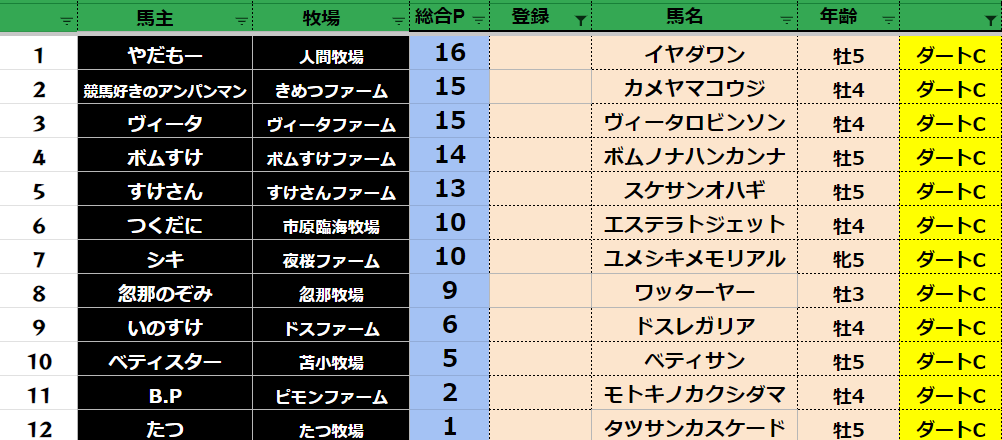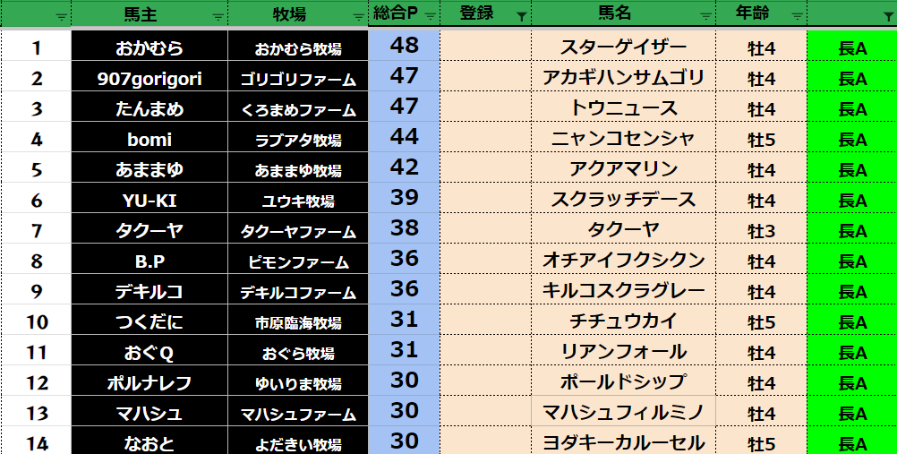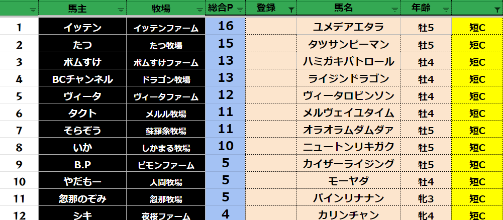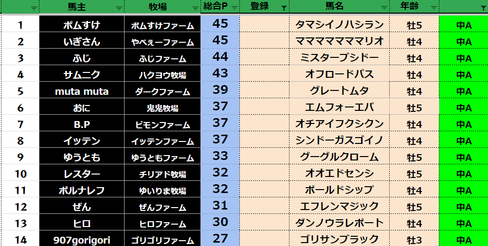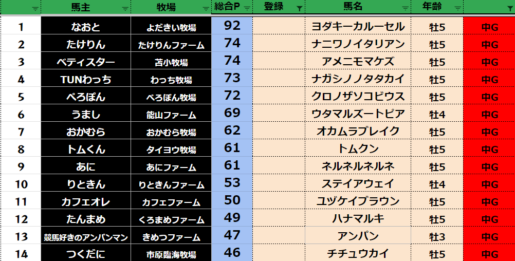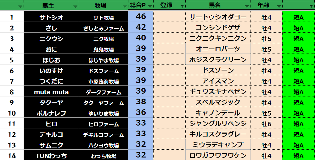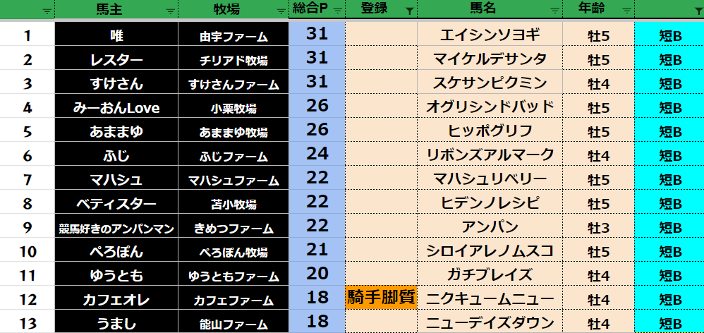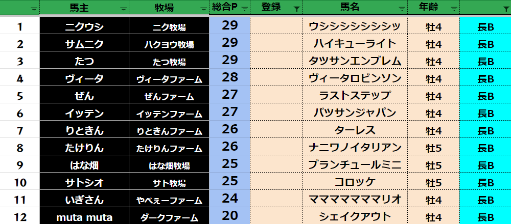 参加馬主:54名 全登録馬:209頭