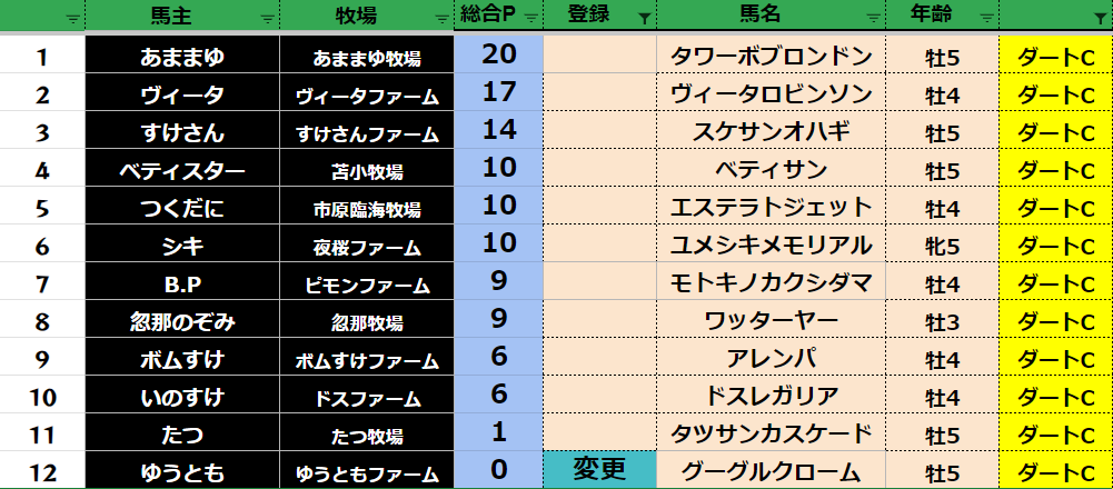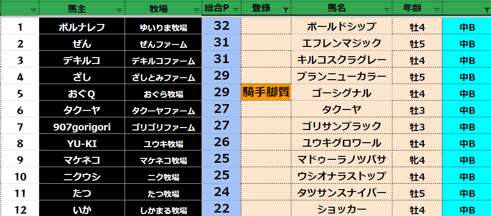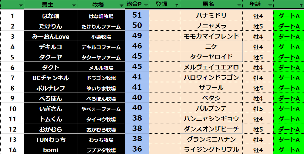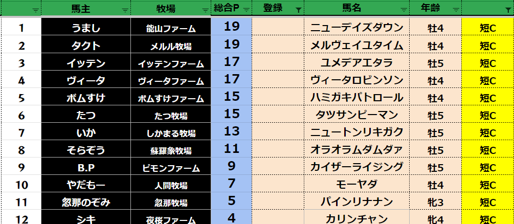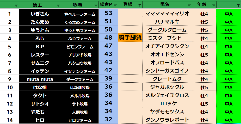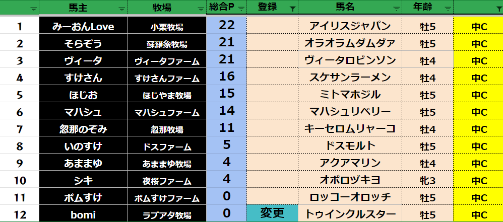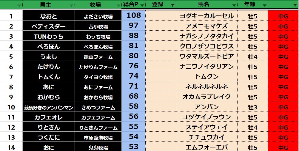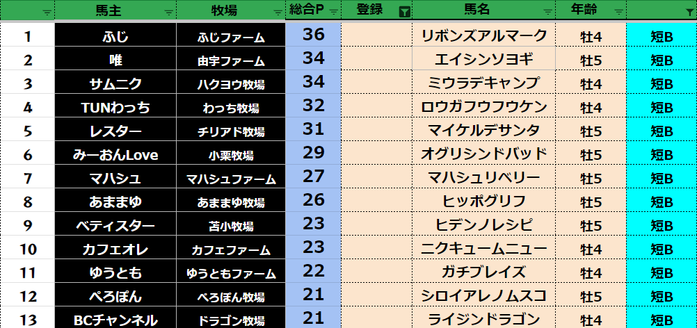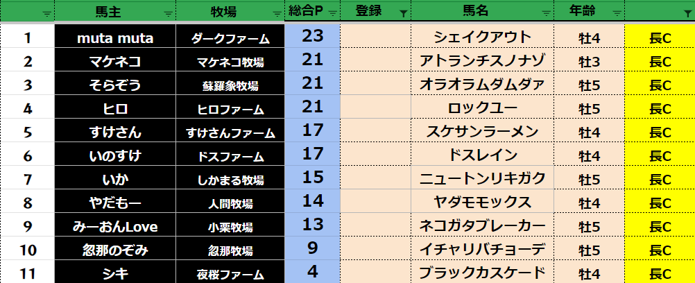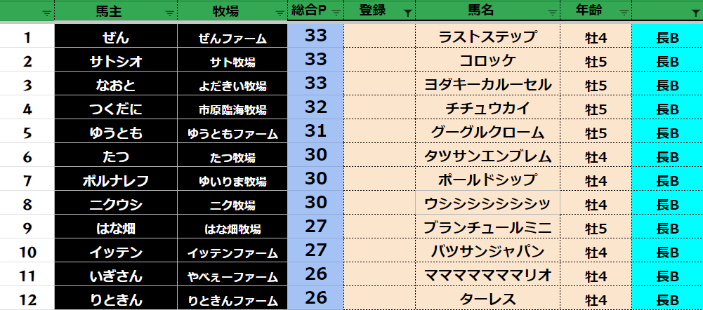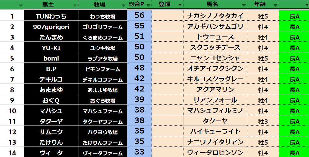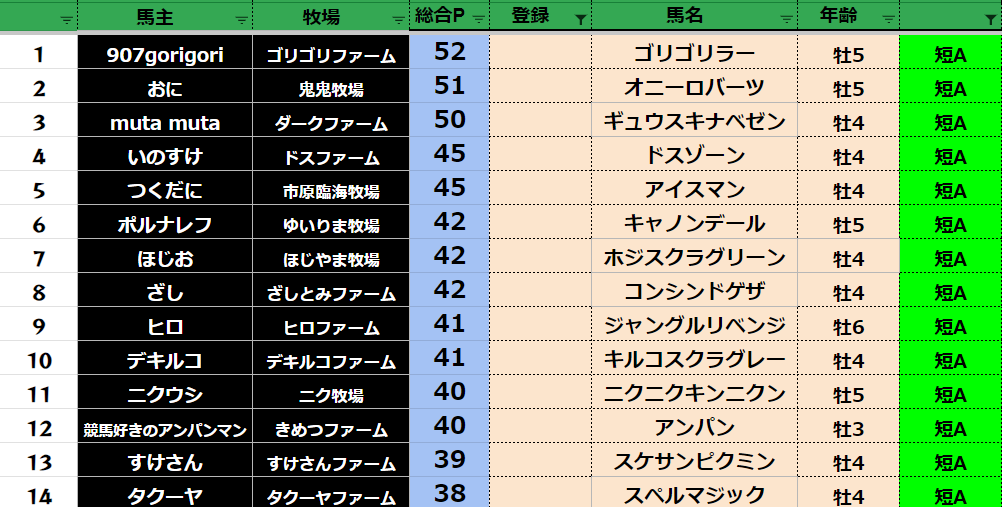 参加馬主:54名 全登録馬:209頭