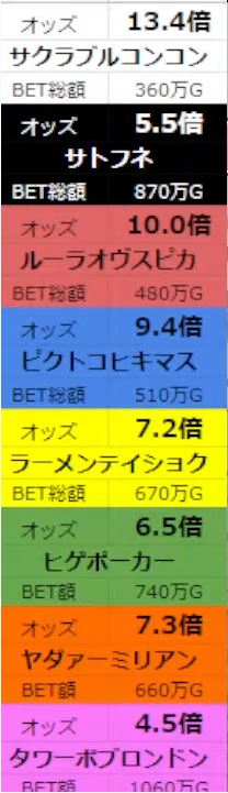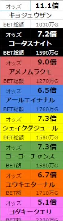 ダビクエでは前シーズンからの活躍もありヨダキークエリが1番人気になった。倍率は5.1倍。このレースも人気が割れており5番人気までは倍率が全く変わらないレースとなった。