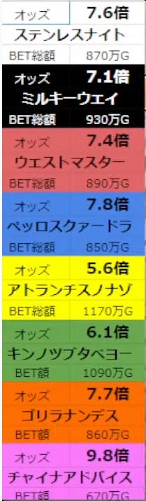 その中でも1番人気に成ったのはアトランチスノナゾ。5.6倍。ただし8番人気まで差がなく全頭1桁倍率でした。まさかのゲーム上一番印をとったチャイナアドバイスが8番人気。しかし倍率は9.8倍。どの馬が来てもおかしくない状態です。