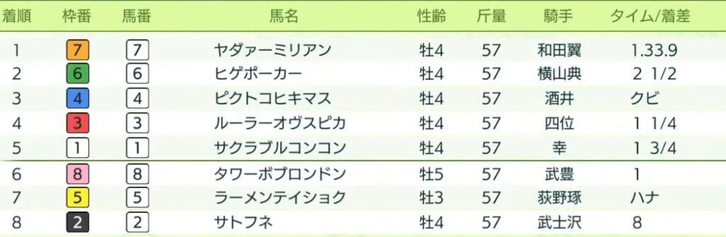 スタートはピクトコヒキマスとサトフネが好スタート!スタート直後の芝コースで激しいハナの奪い合いをする2頭。先頭争いを制したのはピクトコヒキマス。隊列は先行馬と追い込み馬の2グループに別れた。直線向いてピクトコヒキマスが後続を突き放しにかかるが連れて上がっていったのがラーメンテイショク、更に外からヤダァーミリアン。後方待機勢はあまり伸びてこない、外から伸びてきたヤダァーミリアンが先頭に立ってゴールイン!