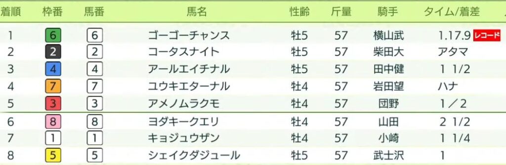 スタートは6番ゴーゴーチャンスと8番ヨダキークエリが好スタート。まずハナを奪ったのはヨダキークエリ。そしてかかり気味に上がっていったのがコータスナイト。コータスナイトはそのまま先頭へ。直線に入って少しコータスナイトが差を広げにかかるが2番手に追走してたゴーゴーチャンスも必死に食らいついていく。このまま2頭の叩き合いがあり最後ゴール前ではわずかにゴーゴーチャンスが捉えてゴールイン。