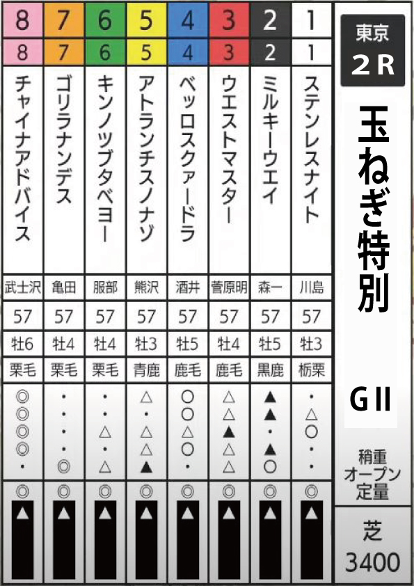 スタートはきれいに1列揃ったスタート。まず先頭を伺ったのは3番ウエストマスター。と思いきやこのゲームの十八番『ランド砲』が発動してしまいズルズルと後退。それを見てハナを主張したのが4番ベッロスクァードラ。更に外からキンノツブタベヨーが交わして先頭になる。そして2番手には8番のチャイナアドバイス。そのままの隊列で最後の直線、逃げるキンノツブタベヨーに襲いかかるのはミルキーウエイ、更にその外から1番人気のアトランチスノナゾが伸びてくる。2頭が叩きあっている後方外から1番の白い帽子ステンレスナイトがすごい脚で追い上げてきて抜け出してゴールイン!