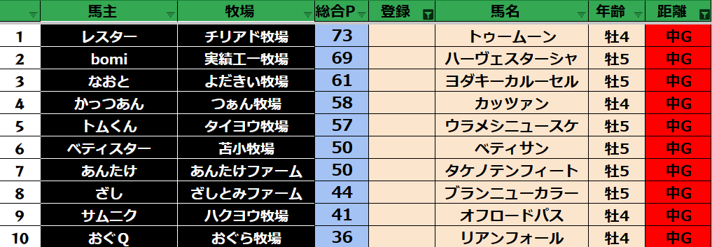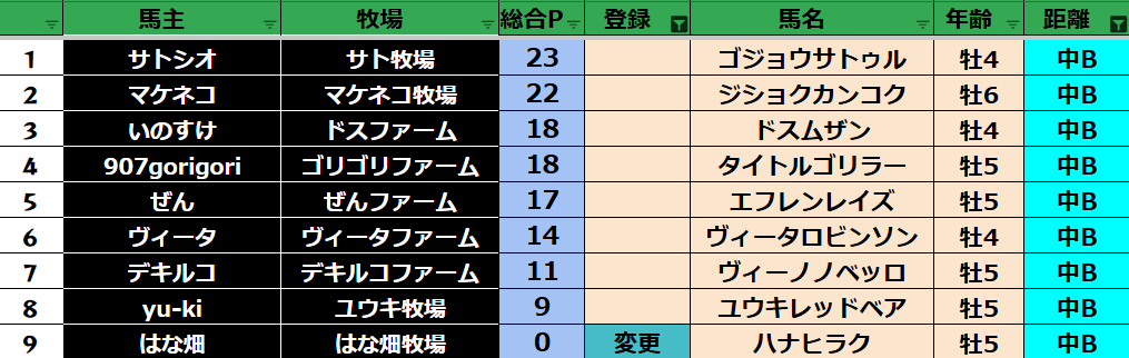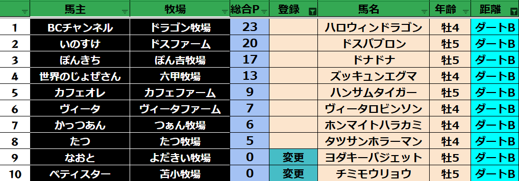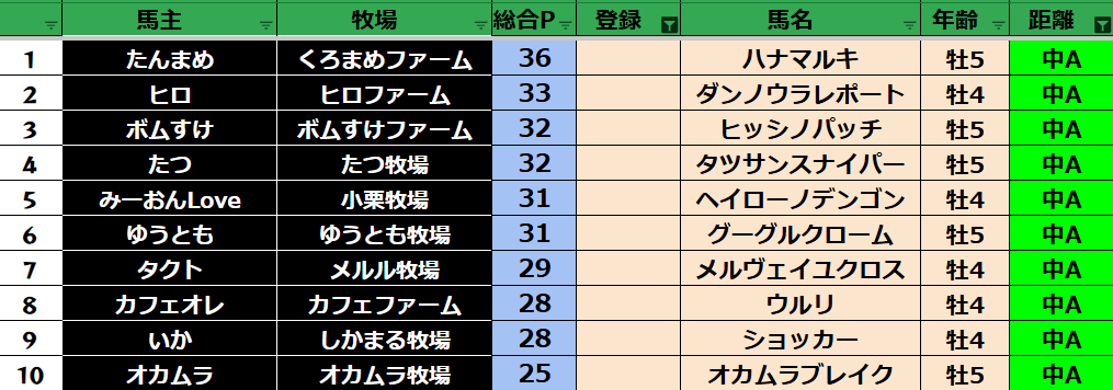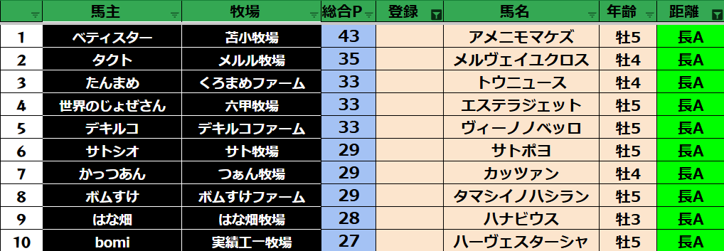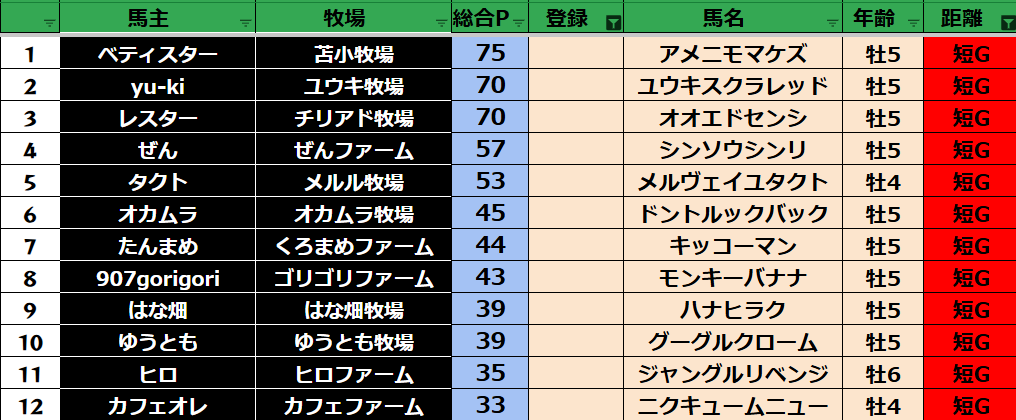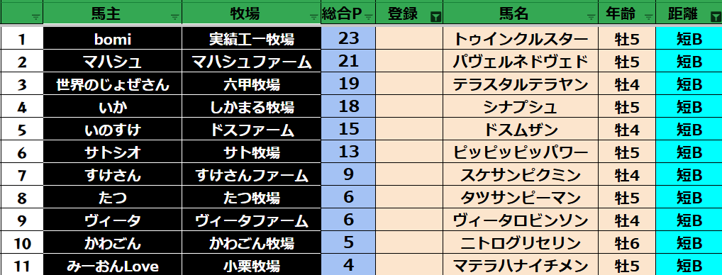ゲーム ダビスタ 【ダビスタSwitch】suke3BC season5 2月2週目 クラス振り分け確定! 2025年2月13日 2025年2月13日 Facebook postはてブLINEPocketFeedly 今週のクラス分けとなります! 参加馬主:35名 全登録馬:125頭 ダート:32頭 短距離:34頭 中距離:29頭 長距離:30頭 Contents 【ダート】 【短距離】 【中距離】 【長距離】 Facebook postはてブLINEPocketFeedly