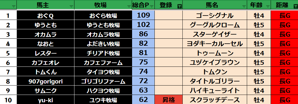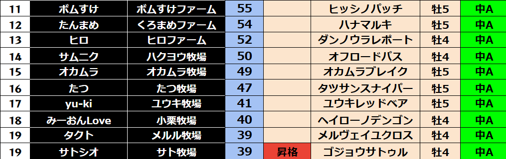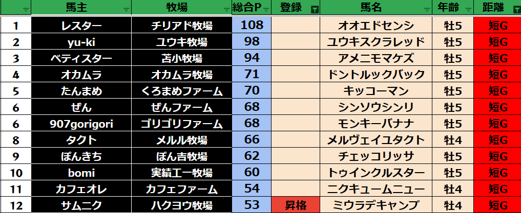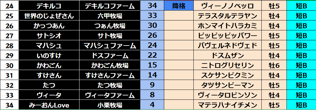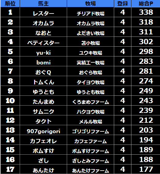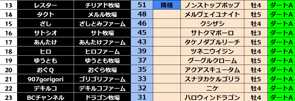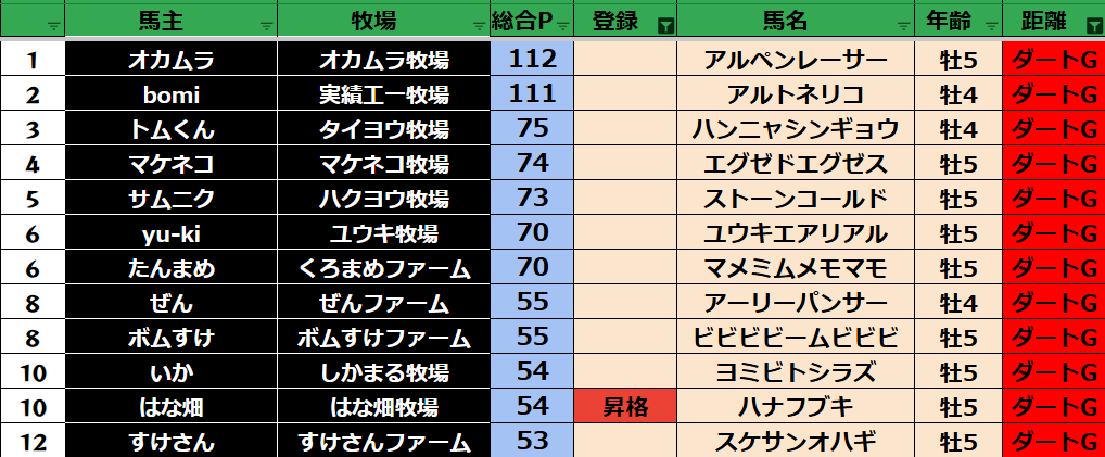 ダビスタ 【ダビスタSwitch】suke3BC season2 9月2週目 クラス振り分け確定! 今週のクラス分け発表です。 【9月2週目】 参加馬主:80名 全登録馬:310頭 ダート:77頭 長距離:77頭 中距離:77頭 短距離:7...