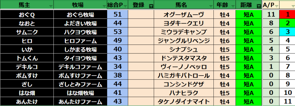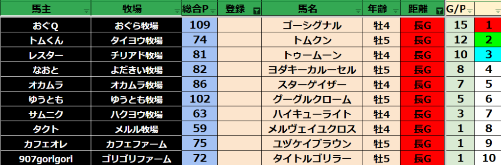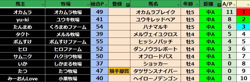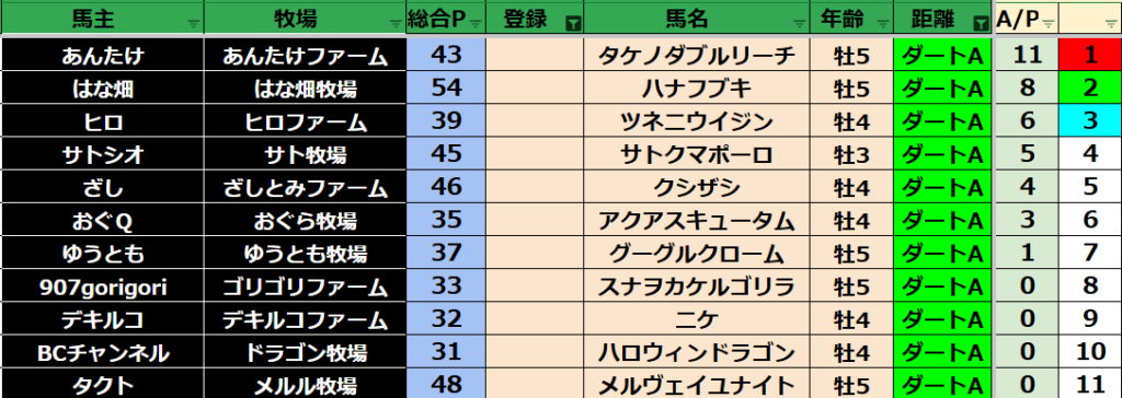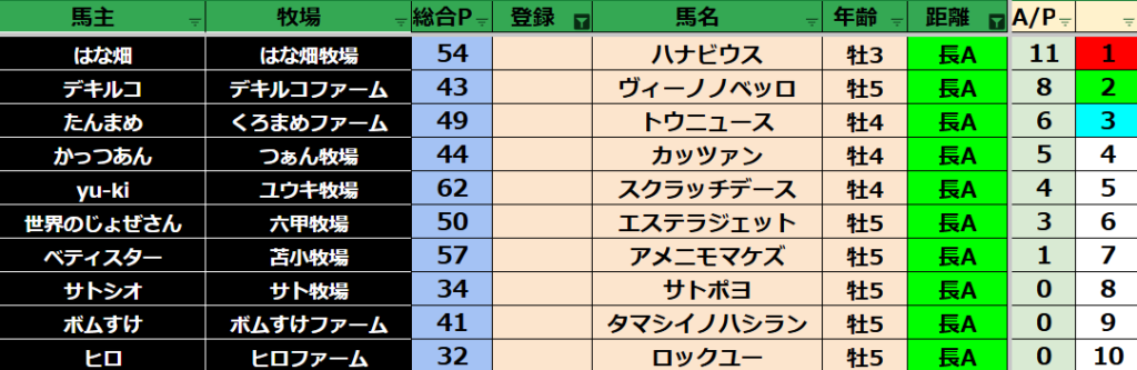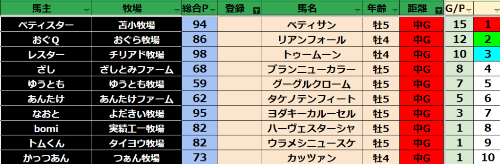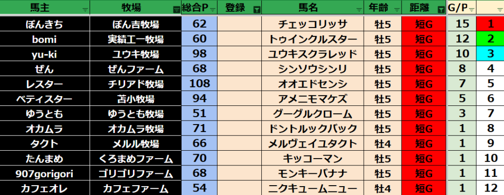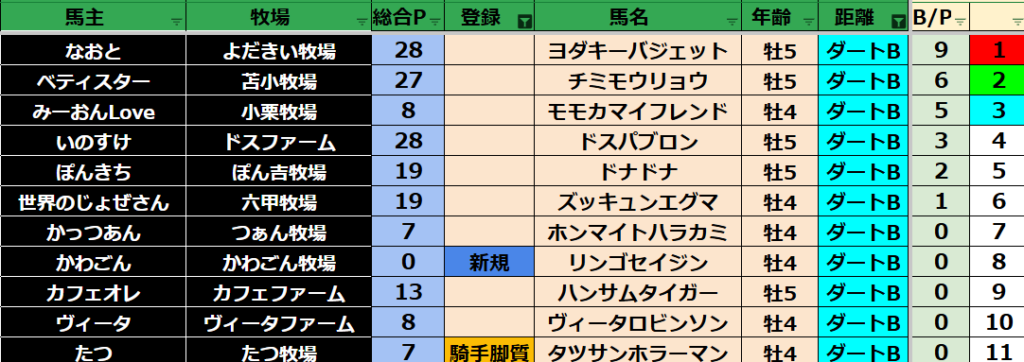 ゲーム ダビスタ 【ダビスタSwitch】suke3BC season5!! 3月1週目 結果発表!! 2025年3月11日 2025年3月11日 Facebook postはてブLINEPocketFeedly 先週の結果の方まいります! Contents 【ダート結果】 【ダートランキング】 【短距離結果】 【短距離ランキング】 【中距離結果】 【中距離ランキング】 【長距離結果】 【長距離ランキング】 【馬主総合ランキング】 Facebook postはてブLINEPocketFeedly