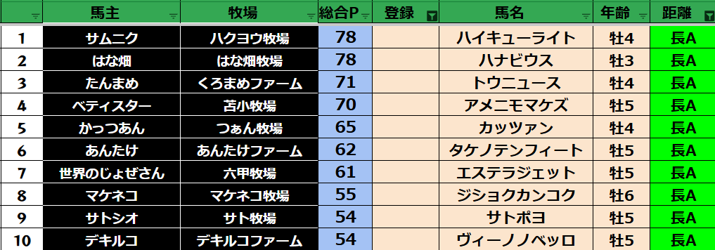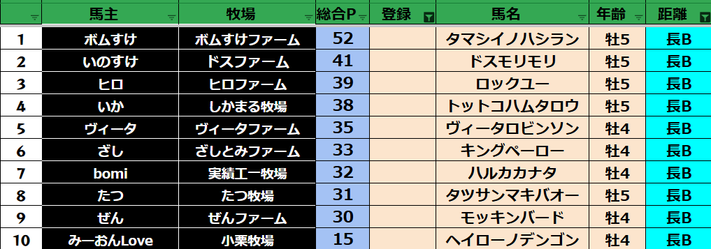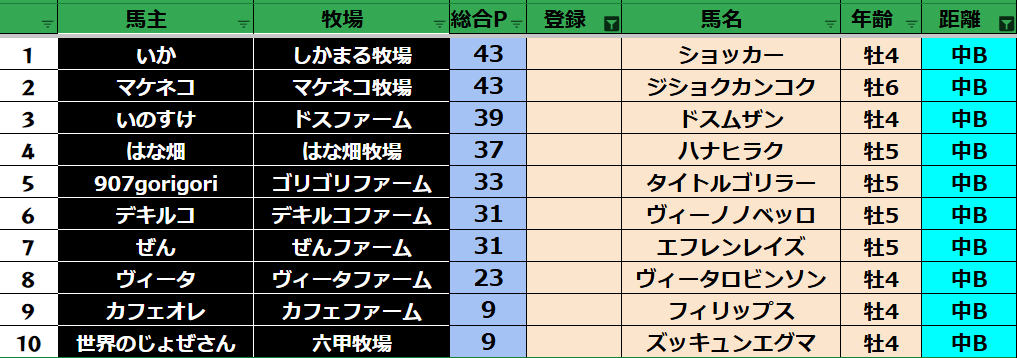 ゲーム ダビスタ 【ダビスタSwitch】suke3BC season5 4月3週目 クラス振り分け確定! 2025年4月18日 2025年4月18日 Facebook postはてブLINEPocketFeedly さぁ今週の振り分けになります! 参加馬主:35名 全登録馬:128頭 ダート:34頭 短距離:34頭 中距離:30頭 長距離:30頭 Contents 【ダート】 【短距離】 【中距離】 【長距離】 Facebook postはてブLINEPocketFeedly