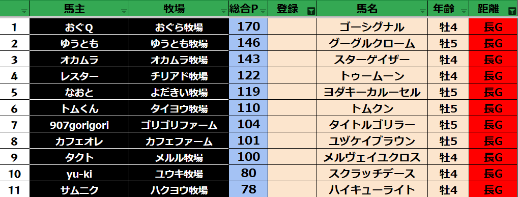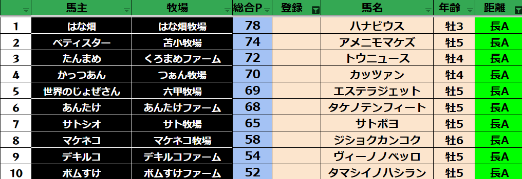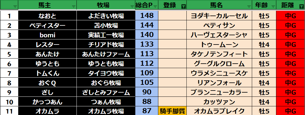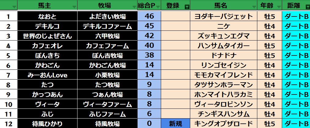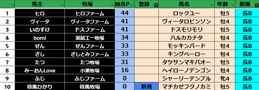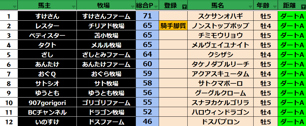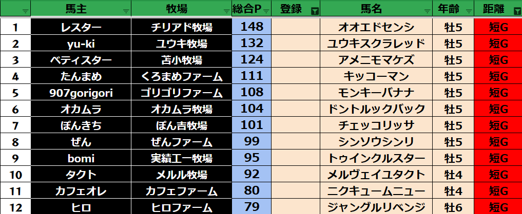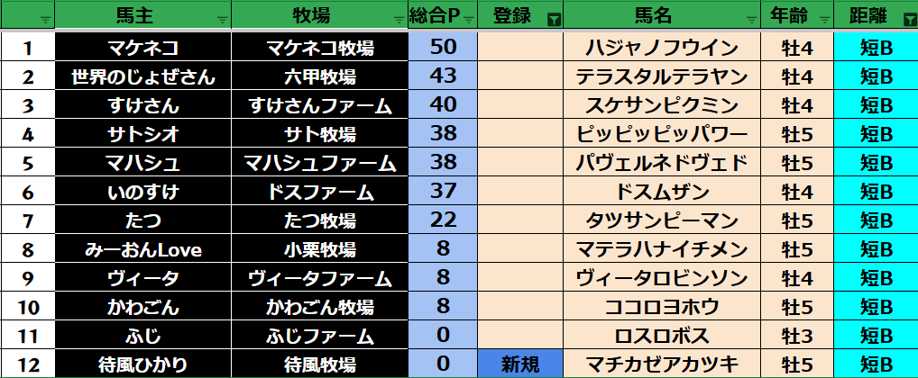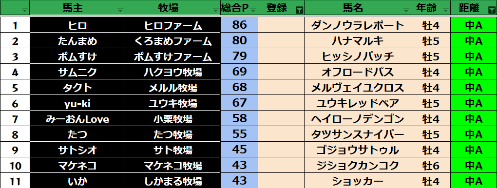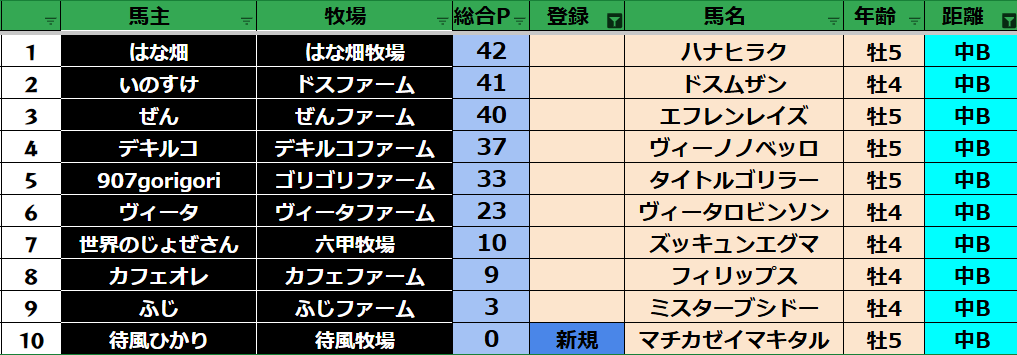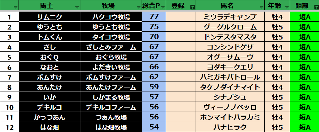 ゲーム ダビスタ 【ダビスタSwitch】suke3BC season5 4月4週目 クラス振り分け確定! 2025年4月24日 2025年4月24日 Facebook postはてブLINEPocketFeedly さぁ今週の振り分けになります! 参加馬主:37名 全登録馬:136頭 ダート:36頭 短距離:36頭 中距離:32頭 長距離:32頭 Contents 【ダート】 【短距離】 【中距離】 【長距離】 Facebook postはてブLINEPocketFeedly