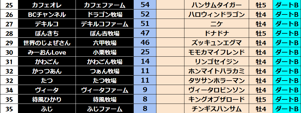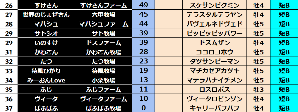 ダビスタ 【ダビスタSwitch】suke3BC season2 9月3週目結果発表! 今週もご視聴ありがとうございました! それでは9月3週目の結果発表です! 【短距離結果】 【短距離ランキング】 【中距離結果】 【...