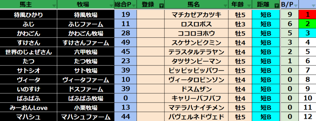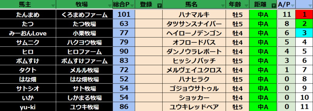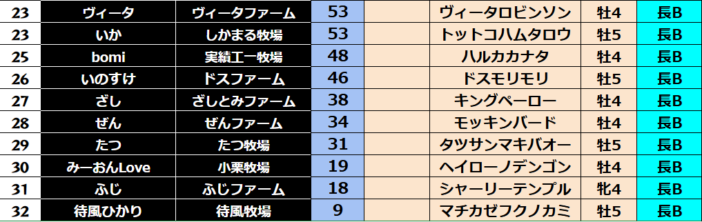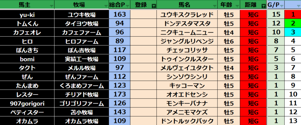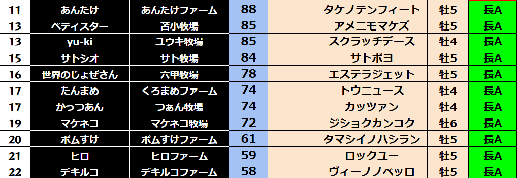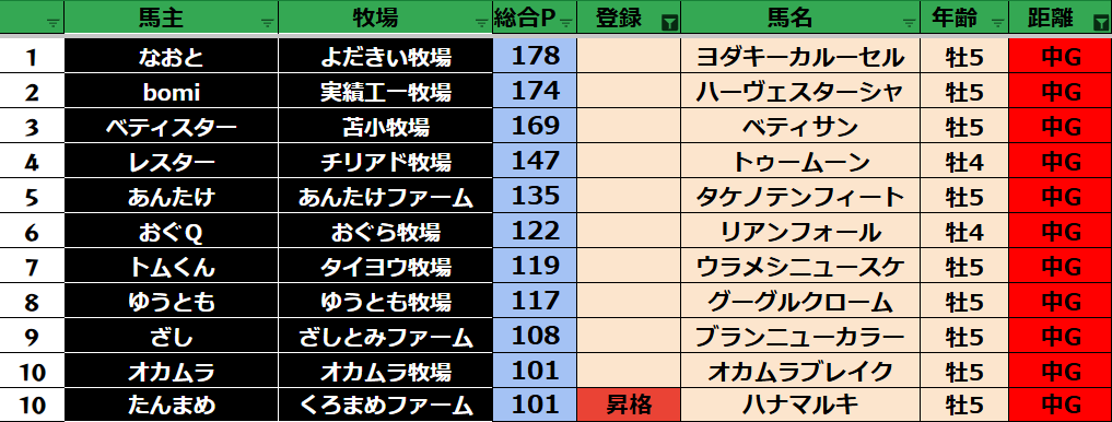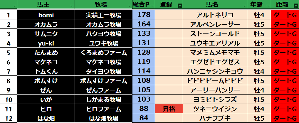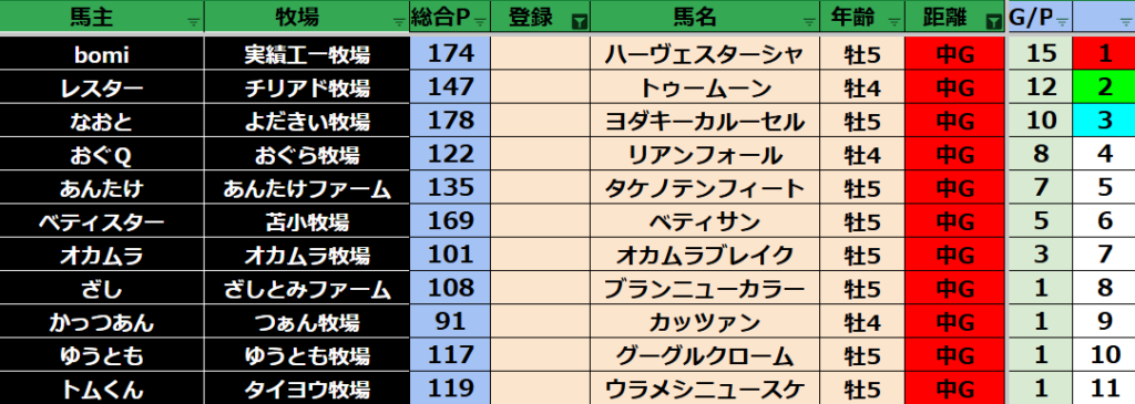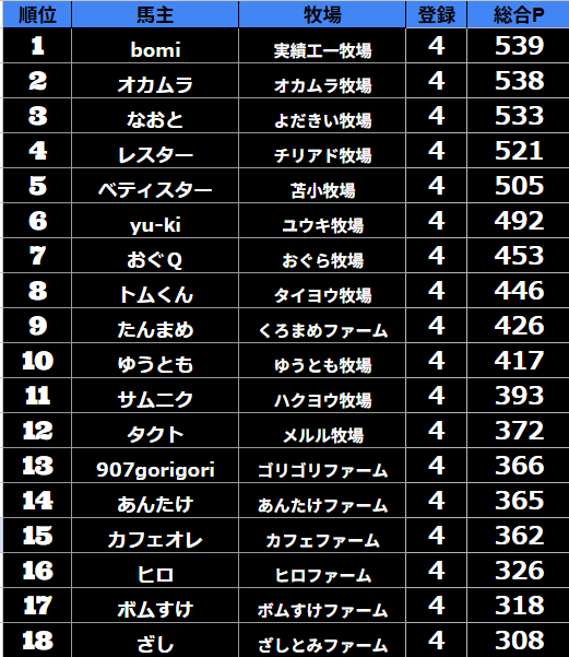 ゲーム ダビスタ 【ダビスタSwitch】suke3BC season5!! 5月2週目 結果発表!! 2025年5月19日 2025年5月19日 Facebook postはてブLINEPocketFeedly 先週の結果の方まいります! Contents 【ダート結果】 【ダートランキング】 【短距離結果】 【短距離ランキング】 【中距離結果】 【中距離ランキング】 【長距離結果】 【長距離ランキング】 【馬主総合ランキング】 Facebook postはてブLINEPocketFeedly