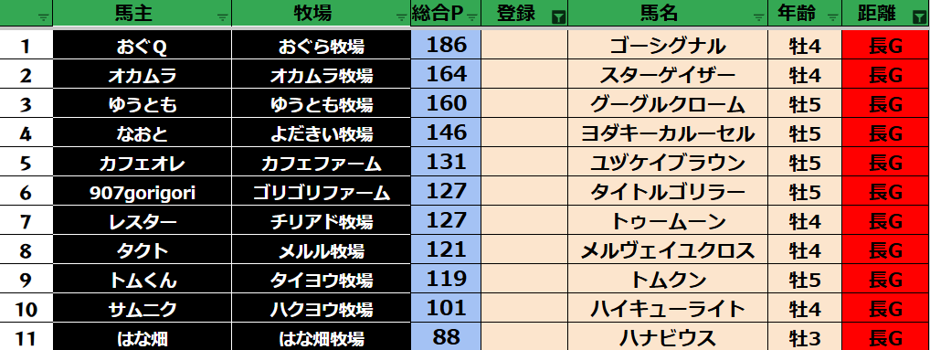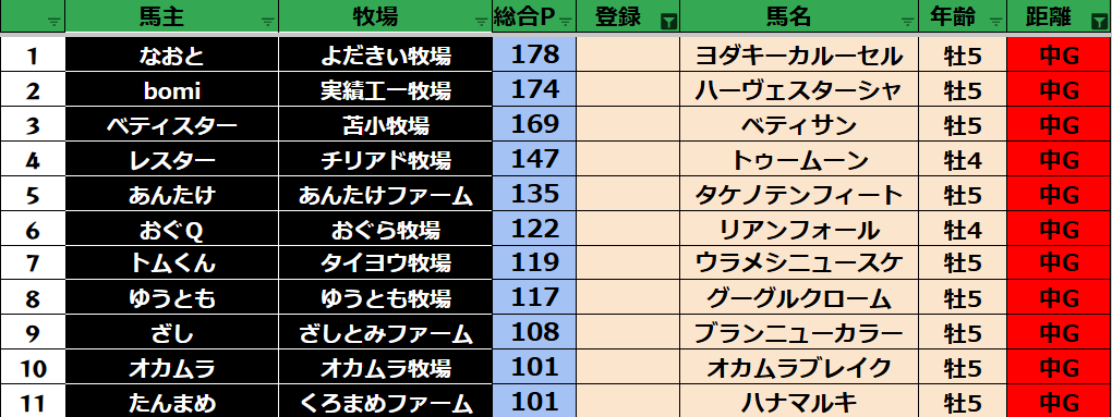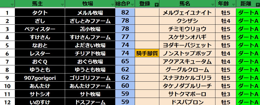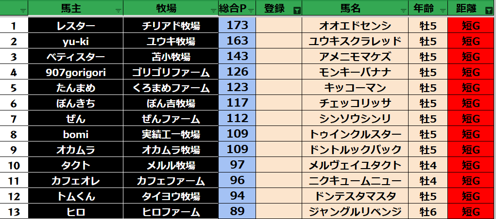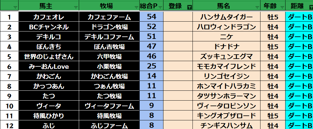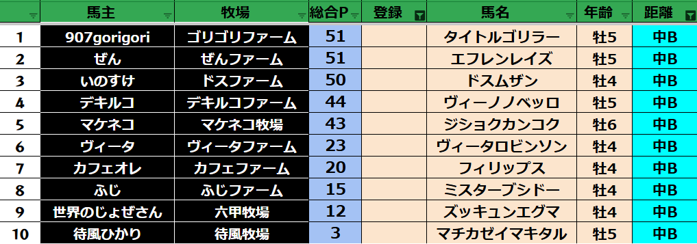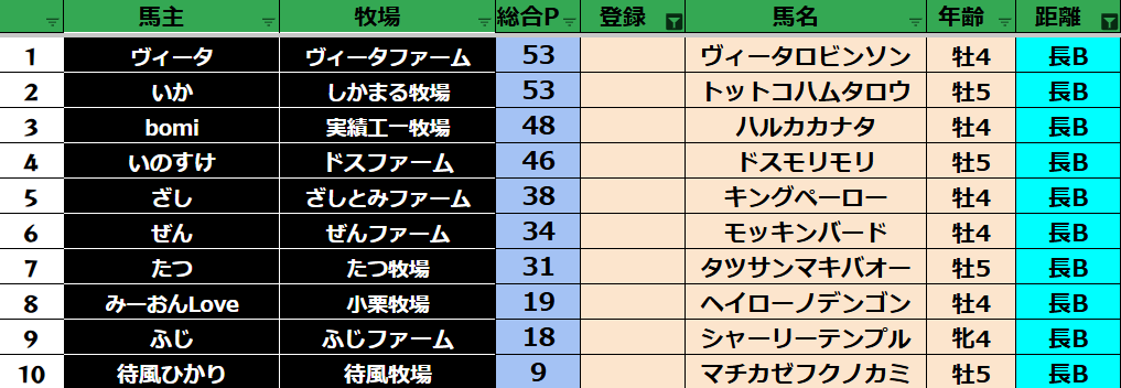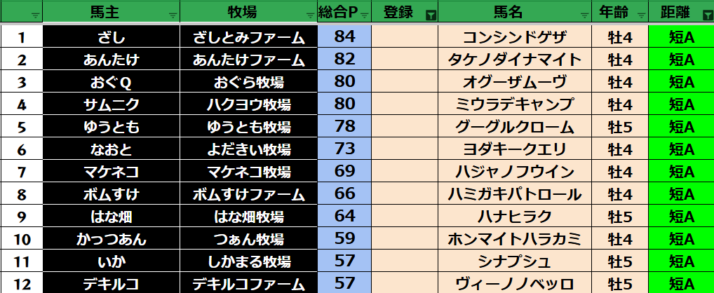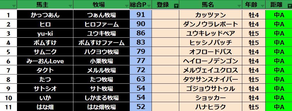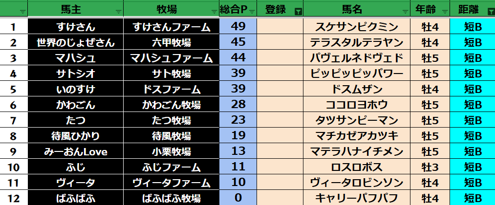 ゲーム ダビスタ 【ダビスタSwitch】suke3BC season5 5月3週目 クラス振り分け確定! 2025年5月23日 2025年5月23日 Facebook postはてブLINEPocketFeedly さぁそれでは今週の振り分けです! 参加馬主:38名 全登録馬:137頭 ダート:36頭 短距離:37頭 中距離:32頭 長距離:32頭 Contents 【ダート】 【短距離】 【中距離】 【長距離】 Facebook postはてブLINEPocketFeedly