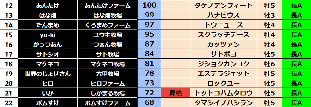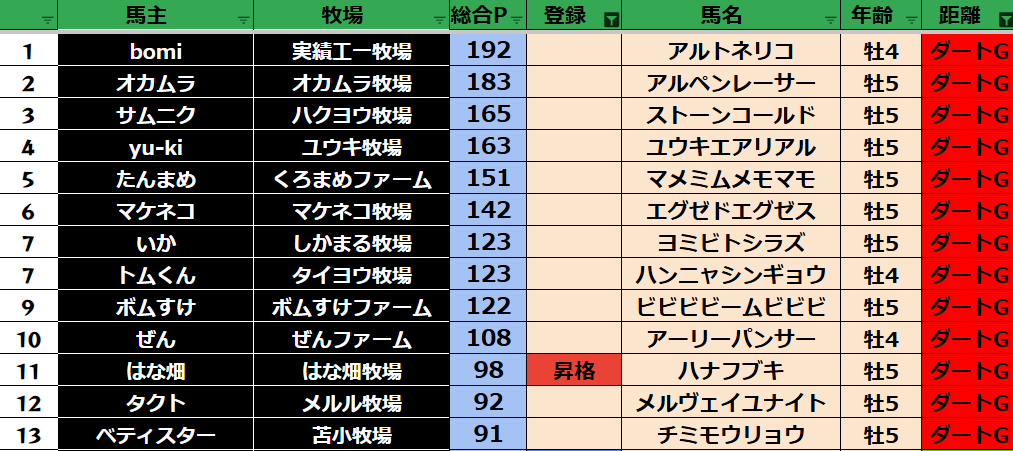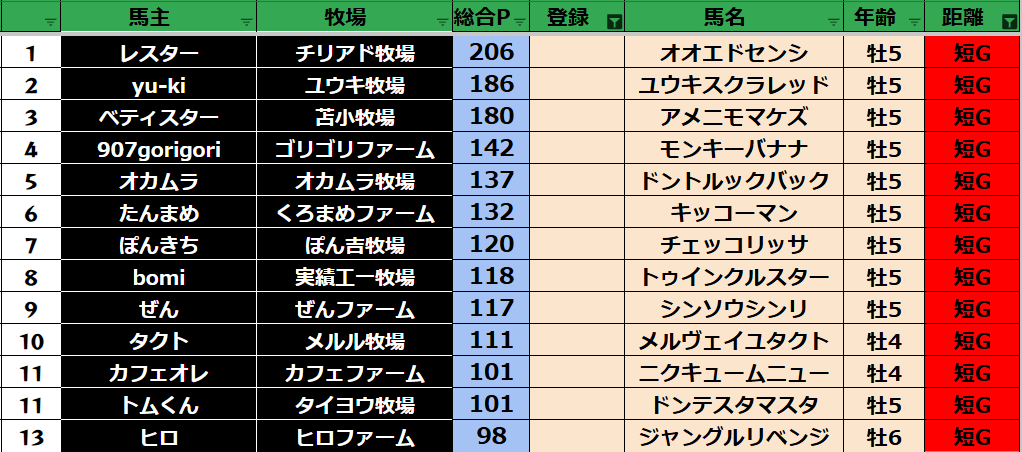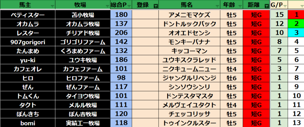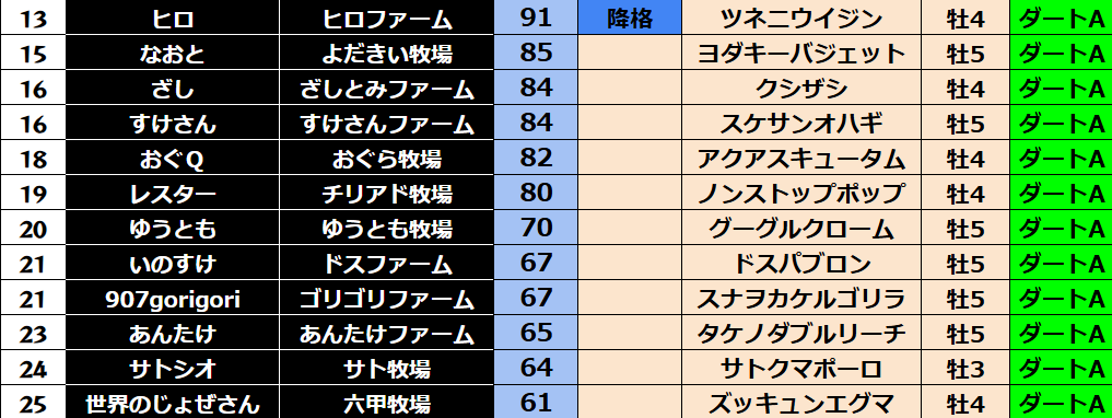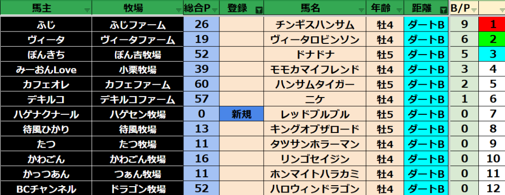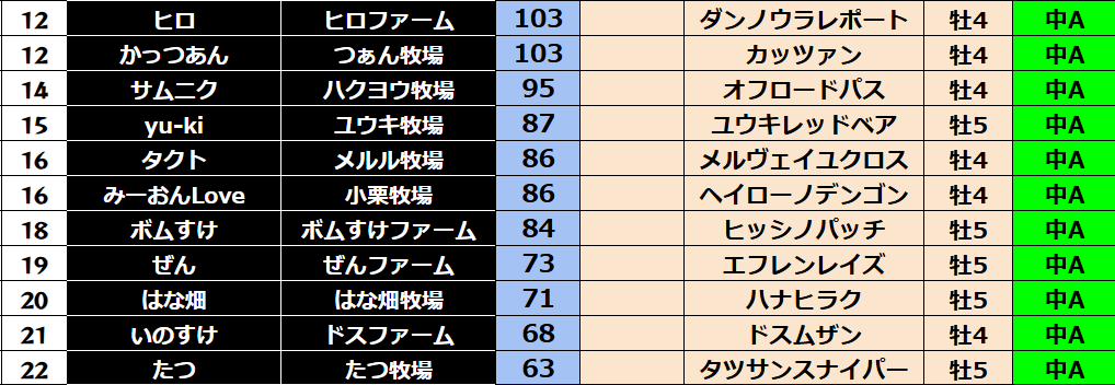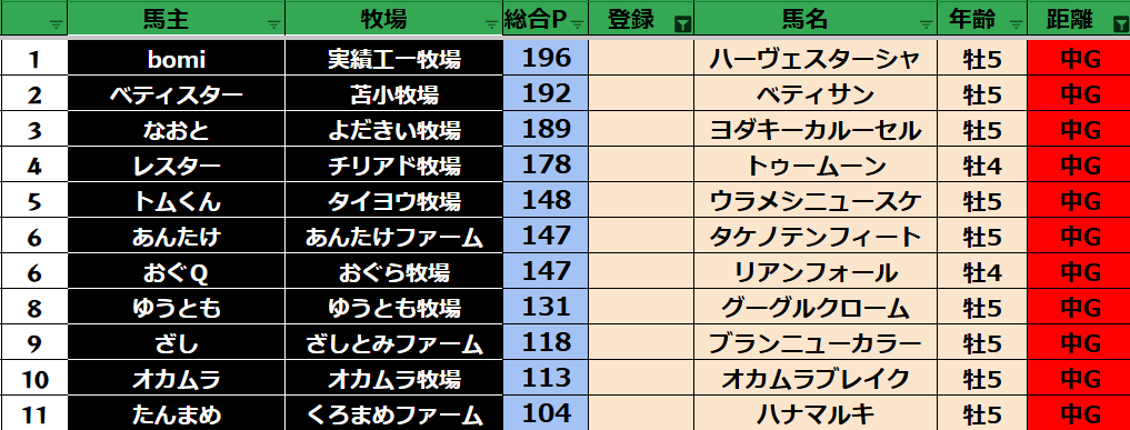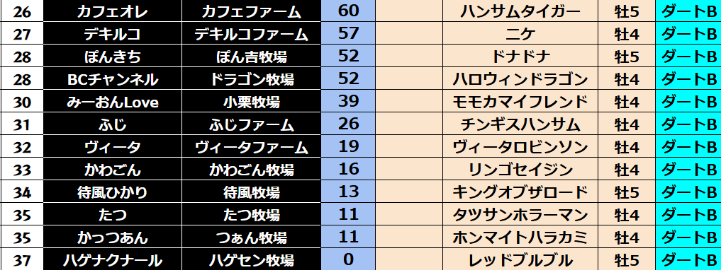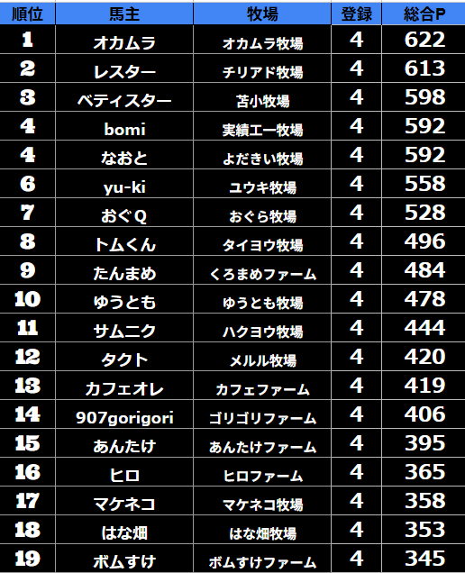 ゲーム ダビスタ 【ダビスタSwitch】suke3BC season5!! 6月1週目 結果発表!! 2025年6月7日 2025年6月7日 Facebook postはてブLINEPocketFeedly 先週の結果の方まいります! Contents 【ダート結果】 【ダートランキング】 【短距離結果】 【短距離ランキング】 【中距離結果】 【中距離ランキング】 【長距離結果】 【長距離ランキング】 【馬主総合ランキング】 Facebook postはてブLINEPocketFeedly